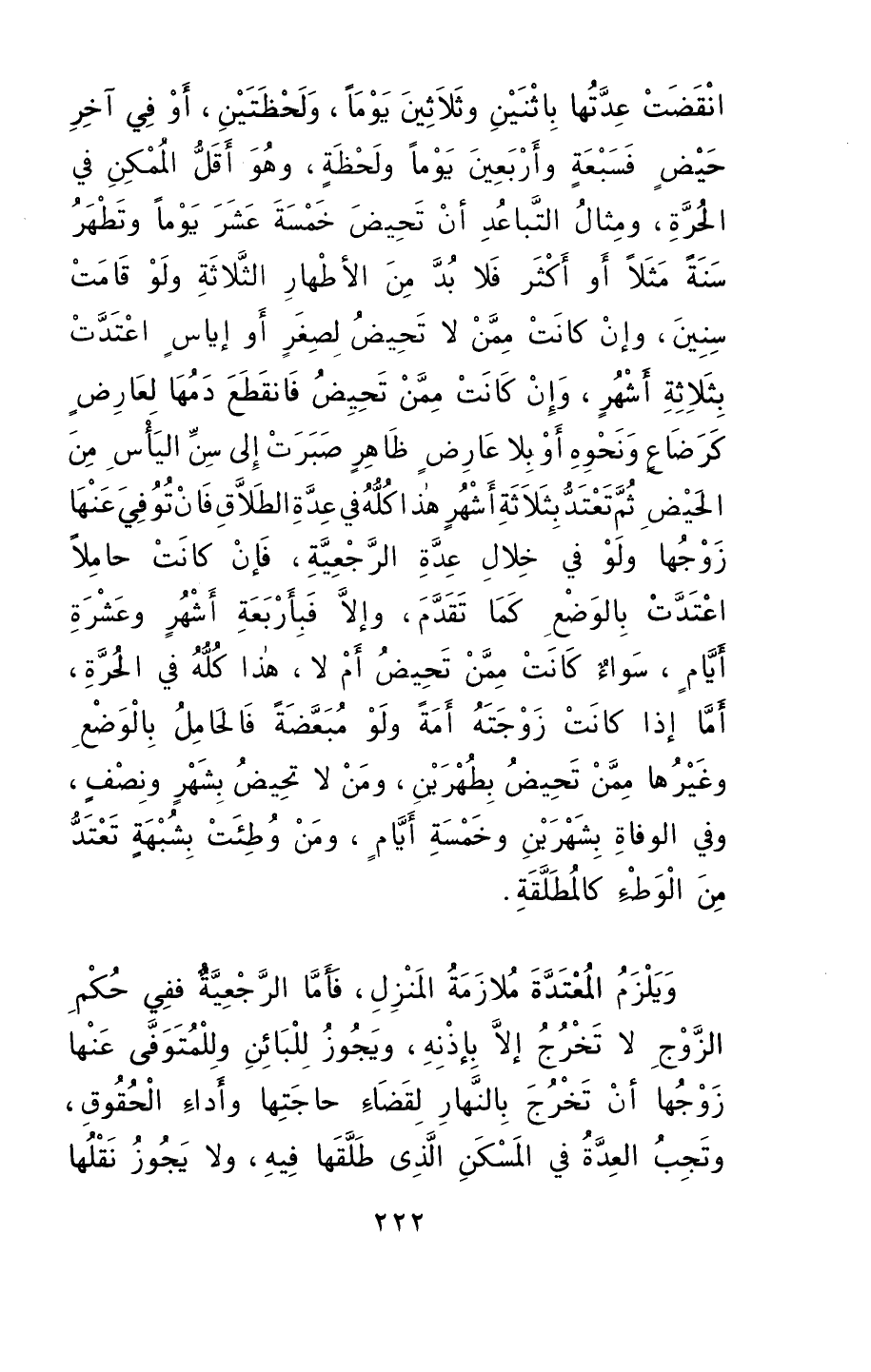 ويَلزمُ المُعتدَّةَ ملازمةُ المنزِلِ، فأمَّا الرَّجعيَّةُ ففي حُكْمِ الزَّوْجِ لا تَخْرُجُ إلاَّ بإذنِهِ، ويجوزُ لِلبائنِ ولِلمُتَوفَّى عنْها زوْجُها أنْ تَخْرُجَ بالنَّهارِ لِقَضاءِ حاجَتِها وأداءِ الحُقوقِ، وتجِبُ العِدَّةُ في المسْكنِ الذي طلَّقَها فيهِ، ولا يجوزُ نقْلُها