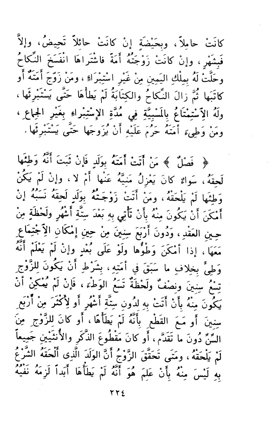 كانت حاملاً، وبحيضَةٍ إنْ كانتْ حائلاً تحيضُ، وإلا فبِشَهرٍ، وإنْ كانت زوْجتُهُ أمَةً فاشتراها انفسخَ النِّكاحُ، وحلَّتْ لهُ بمِلْكِ اليمينِ مِنْ غيرِ استبراءٍ، ومنْ زوَّجَ أمتَهُ أو كاتبها ثمَّ زالَ النِّكاحُ والكِتابةُ لمْ يطأَها حتى يستبْرِئَها، ولهُ الاستمتاعُ بالمَسْبيَّةِ في مُدَّةِ الاستبْراءِ بغيرِ الجِماعِ، ومنْ وطِئ أمَتَهُ حَرُمَ عليهِ أنْ يُزوِّجها حتّى يَستَبْرِئَها.