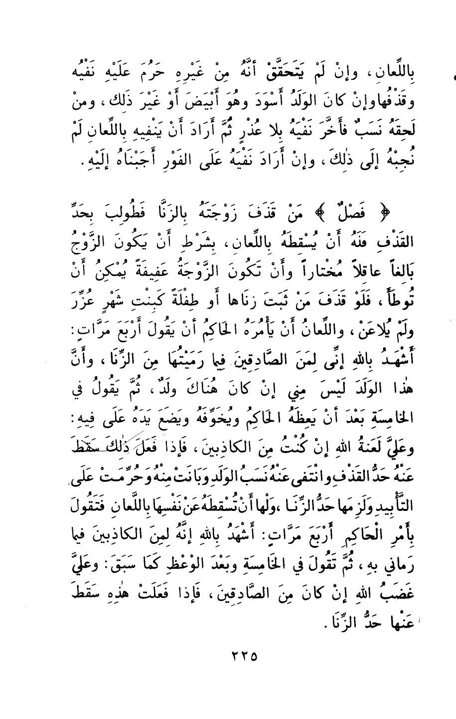 واللعانُ أنْ يَأمُرَهُ الحاكمُ أنْ يقولَ أرْبعَ مرَّاتٍ: أَشْهدُ باللهِ إنِّي لَمِنَ الصَّادِقينَ فيما رَمَيْتُها منَ الزِّنا، وإنَّ هذا الولَدَ ليْس منِّي -إنْ كان هناك ولدٌ- ثمَّ يقولُ في الخامسةِ، بعدَ أن يَعِظَهُ الحاكمُ ويُخوِّفُهُ ويضَعَ يدَهُ على فيهِ: وعليَّ لَعْنَةُ اللهِ إنْ كُنْتُ منَ الكاذبينَ. فإذا فعلَ ذلكَ سقطَ عنهُ حدُّ القذفِ، وانتفى عنهُ نسبُ الولدِ، وبانتْ منهُ وحرُمتْ على التّأبيدِ، ولزمها حدُّ الزِّنا.