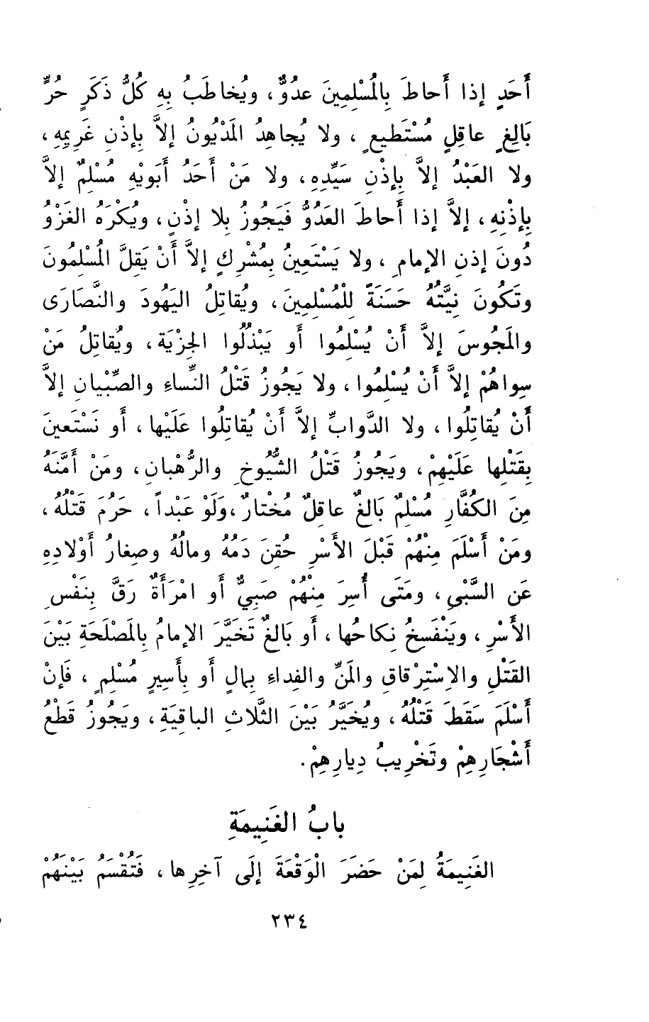 ويُخاطبُ بهِ كُلُّ ذَكَرٍ، حُرٍّ، بالغٍ، عاقلٍ، مُستطيعٍ، ولا يُجاهِدُ المَدْيونُ إلاّ بإذنِ غريمِهِ، ولا العبْدُ إلاّ بإذنِ سيِّدهِ، ولا منْ أحدُ أبويهِ مُسْلمٌ إلاّ بإذنِهِ، وإلاّ إذا أحاطَ العَدُوُّ فيَجوزُ بلا إذنٍ، ويُكْرهُ الغَزْوُ دونَ إذنِ الإمامِ، ولا يَستَعينُ بِمُشْركٍ إلاّ أنْ يَقِلَّ المُسلمونَ، وتكونُ نِيَّتُهُ حَسَنَةً للمُسلمينَ، ويُقاتِلُ اليَهودَ والنَّصارى والمَجوسَ إلاّ أنْ يُسْلِموا أو يبذُلوا الجِزيَةَ، ويُقاتِلُ منْ سِواهُمْ إلاّ أنْ يُسْلِموا.