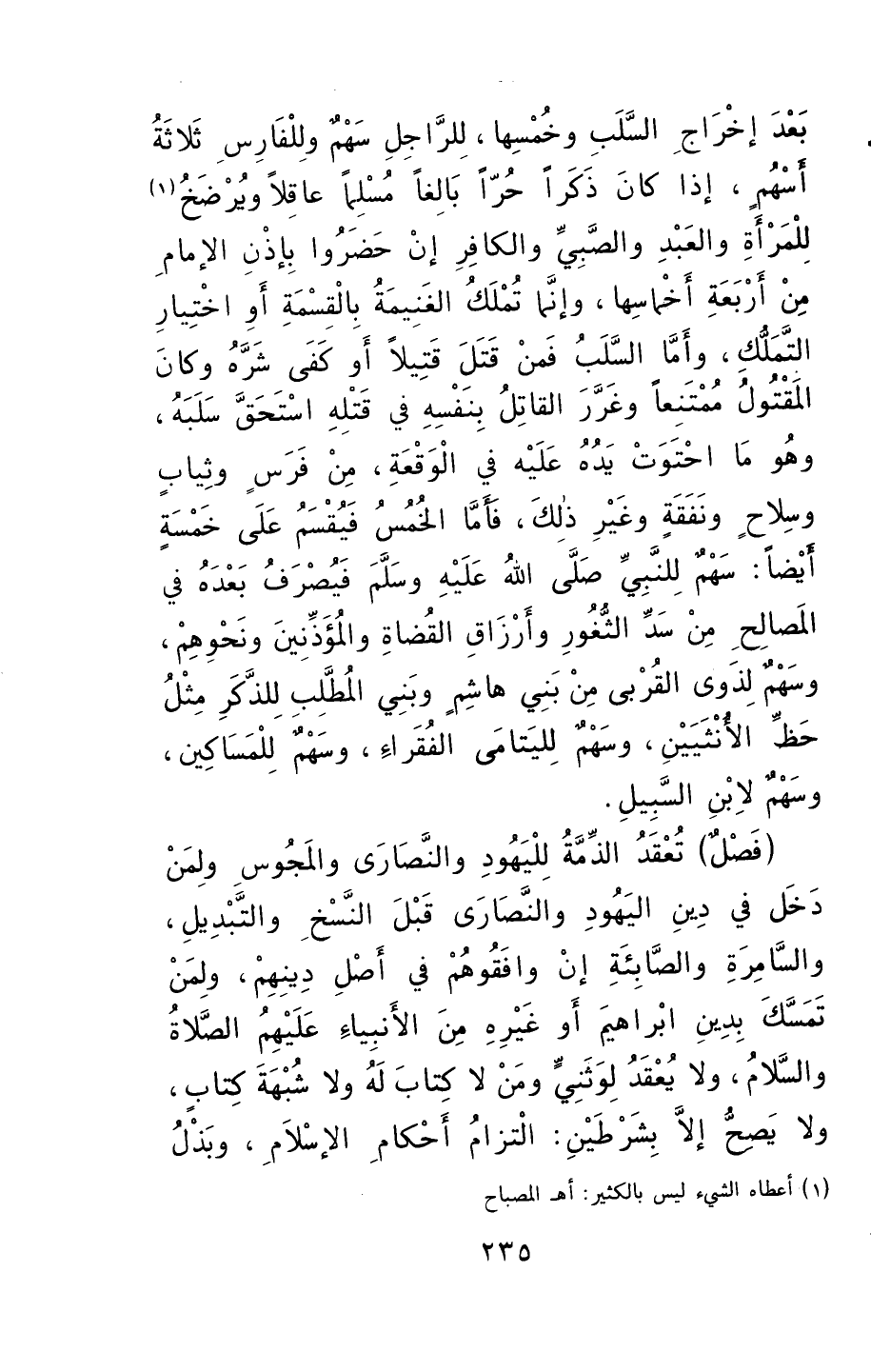 وأمّا السَّلَبُ فمنْ قَتلَ قتيلاً أو كفى شرَّهُ، وكانَ المَقتولُ مُمْتَنِعاً، وغرَّرَ القاتلُ بنفْسِهِ في قتْلِهِ، استَحَقَّ سَلَبَهُ، وهو ما احْتَوَتْ يدُهُ عليهِ في الوَقْعةِ منَ فرَسٍ وثِيابٍ وسلاحٍ ونفَقَةٍ وغيرِ ذلكَ. فأمَّا الخُمُسُ فيُقْسمُ على خمسَةٍ أيضاً: