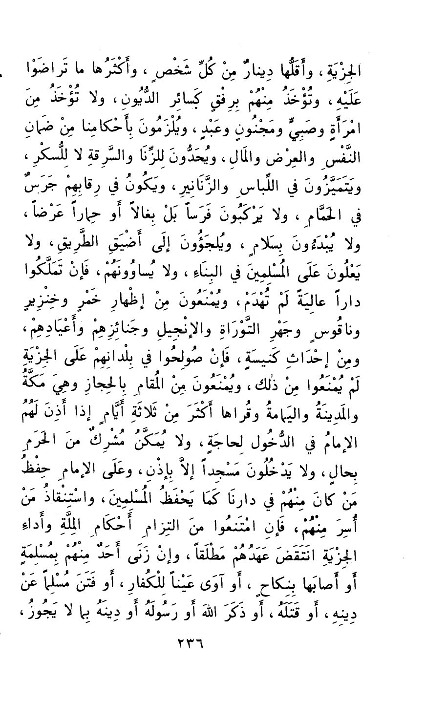 ويُلْزَمونَ بِأحكامِنا منْ ضمانِ النَّفسِ والعِرْضِ والمالِ، ويُحَدُّونَ للزِّنا والسَّرِقةِ، لا للسُّكْرِ، ويَتَمَيَّزونَ في اللِّباسِ والزَّنانيرِ، ويكونُ في رَقابِهِمْ جرسٌ في الحمَّامِ، ولا يَرْكبونَ فَرَساً بلْ بِغالاً أو حِماراً عَرْضاً، ولا يُبدَؤونَ بسلامٍ، ويُلجؤونَ إلى أضْيَقِ الطريقِ، ولا يَعْلونَ على المُسلمينَ في البناءِ ولا يساوونهمْ، فإنْ تَمَلَّكوا داراً عاليةً لمْ تُهدَمْ.