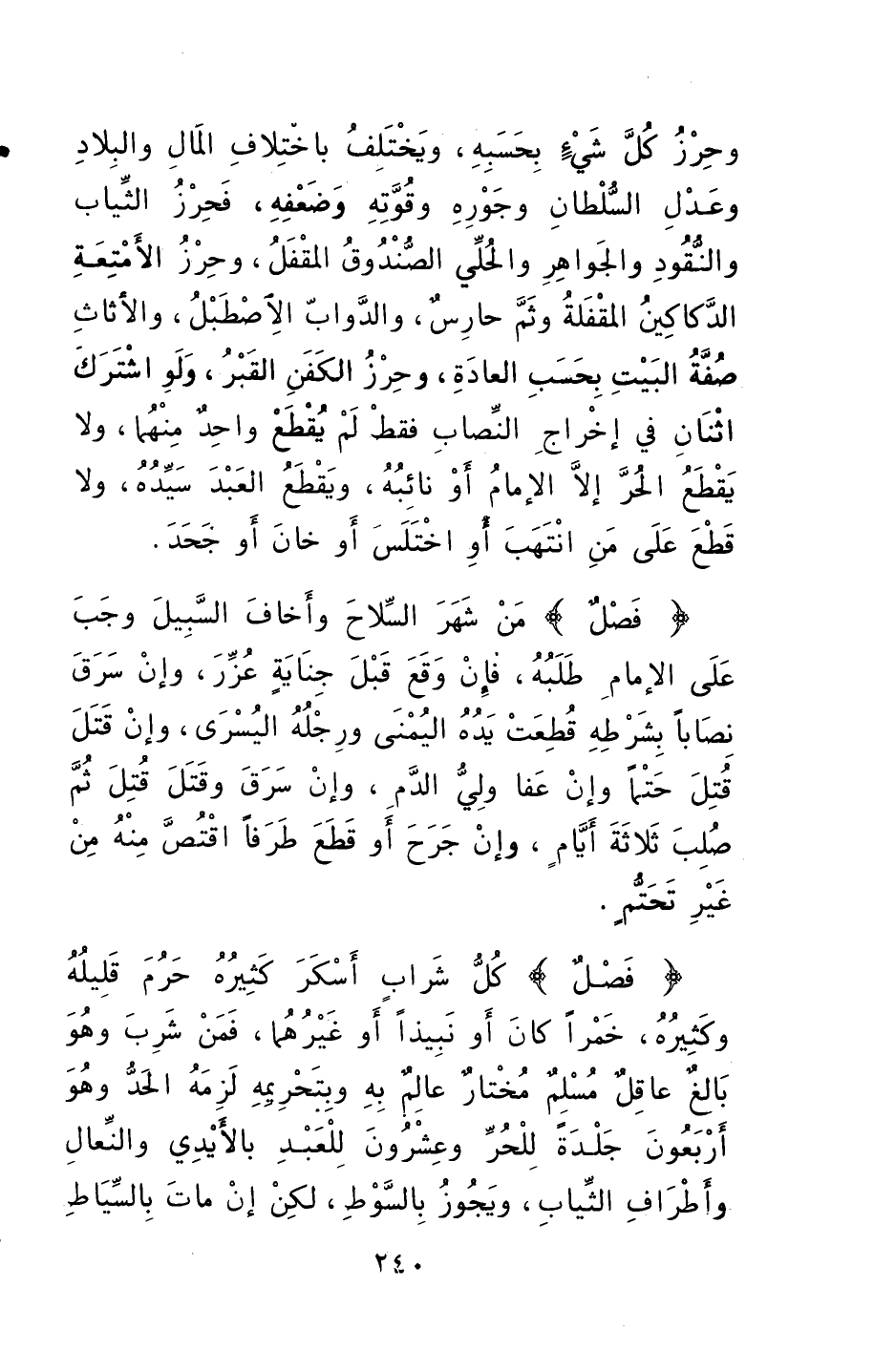 فحِرْزُ الثِّيابِ والنُّقودِ والجواهِرِ والحُليِّ الصُّندوقُ المُقْفَلُ، وحِرْزُ الأمتِعَةِ الدَّكاكينِ المُقْفَلَةِ وثَمَّ حارِسٌ، والدَّوابَّ الاصطَبلُ، والأثاثِ صُفَّةُ البيتِ بحسبِ العادةِ، وحِرْزُ الكَفَنِ القَبْرُ، ولو اشتركَ اثنانِ في إخْراجِ النِّصابِ فقطْ لمْ يُقطعْ واحدٌ منهُما، ولا يَقْطَعُ الحَرُّ إلاّ الإمامُ أو نائِبُهُ، ويَقطعُ العبْدَ سيِّدُهُ، ولا قطْعَ على من انْتَهَبَ أو اخْتَلَسَ أو خانَ أو جحَدَ.