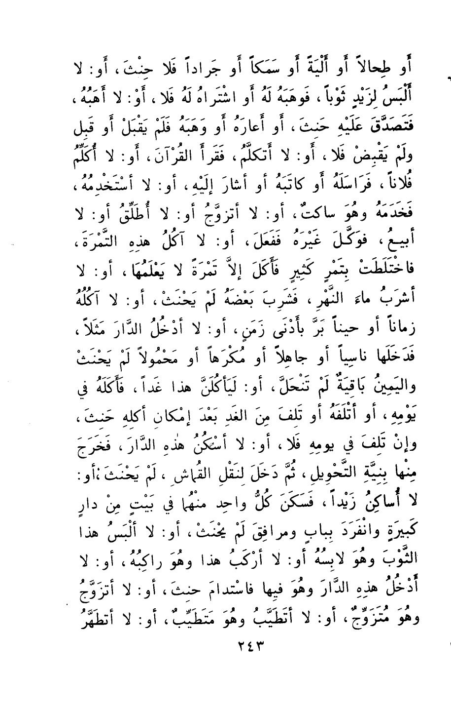 أو طِحالاً أو أَلِيّةً أوْ سمكاً أو جراداً، فلا حِنْث، أو لا أَلْبَسُ لِزَيْدٍ ثوْباً فوَهَبَهُ لهُ أو اشتَراهُ لهُ، فلا، أو لا أَهَبُهُ فتصَدَّقَ عليهِ، حنِثَ، أو أعارهُ أو وهبهُ فلمْ يَقْبَلْ، أو قبِلَ ولمْ يقبِضْ، فلا، أو لا أتكَلَّمَ فقَرأَ القُرآنَ، أو لا أُكَلِّمُ فلاناً فراسَلَهُ أو كاتَبَهُ أو أشارَ إليهِ، أو لا أسْتَخْدِمُهُ فخَدَمَهُ وهوَ ساكتٌ، أو لا أَتَزَوَّجُ أو لا أُطَلِّقُ أو لا أبيعُ فوَكَّلَ غيرَهُ ففَعَلَ، لمْ يَحْنِث، أو لا آكُلُ هذهِ التَّمْرَةَ فاختَلطَتْ بِتَمْرٍ كثيرٍ فأكَلَهُ إلاّ تَمْرَةً واحدَةً لا يَعْلمُها، أو لا أشرَبُ ماءَ النَّهرِ فشَرِبَ بعضَهُ، لم يحنث، أو لا أكلِّمهُ زماناً أو حيناً، بَرَّ بِأدْنى زَمنٍ، أو لا أدخُلُ الدَّارَ مثلاً، فدخلَها ناسِياً أو جاهٍلاً أو مُكْرهاً أو مَحْمولاً، لمْ يَحْنثْ، واليمينُ باقِيَةٌ لمْ تَنْحَلَّ، أو لَيأْكُلَنَّ هذا غَداً فأكلَهُ في يَومِهِ، أو أتْلَفَهُ أو تلِفَ منَ الغدِ بعد إمْكانِ أكلِهِ، حنث، وإنْ تلِفَ في يومِهِ، فلا، أو لا أسْكُنُ هذهِ الدَّارَ فخَرَجَ مِنْها بنِيَّةِ التَّحْويلِ، ثمَّ دخلَ لِنَقْلِ القُماشِ، لمْ يَحنَث، أو لا أُساكِنُ زيْداً فسَكَنَ كُلُّ واحدٍ منهُما في بيْتٍ من دارٍِ كبيرةٍ، وانفردَ ببابٍ ومَرافقَ، لمْ يحنث، أو لا ألْبَسُ هذا الثَّوْبَ وهوَ لابِسُهُ، أو لا أَرْكبُ هذا وهوَ راكِبُهُ، أو لا أَدْخُلُ هذهِ الدَّارَ وهوَ فيها، فاستَدامَ، حنث، أو لا أتزَوَّجُ وهوَ مُتزوِّجٌ، أو لا أتطَيَّبُ وهو مُتطَيِّبٌ، أو لا أتطّهَّرُ