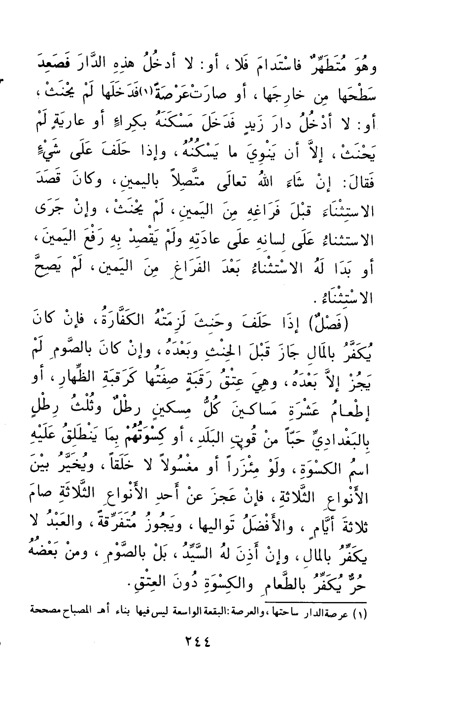 وهيَ عِتْقُ رَقَبَةٍ صِفَتُها كرَقَبَةِ الظِّهارِ، أوْ إطعامُ عشرَةِ مَساكينَ كُلِّ مِسكينٍ رِطْلٌ وثُلُثُ رِطلِ بالبَغْداديِّ حبّاً منْ قوتِ البَلدِ، أو كِسْوَتُهُمْ بما ينطلِقُ عليهِ اسمُ الكِسْوة، ولوْ مِئزَراً ومغسولاً، لا خَلَقاً، ويُخَيَّرُ بيْنَ الأنواعِ الثَّلاثَةِ، فإنْ عجَزَ عن أحدِ الأنواعِ الثَّلاثةِ صامَ ثلاثةَ أيّامٍ، والأفضَلُ توالِيها، ويجوزُ مُتَفَرِّقةٌ.