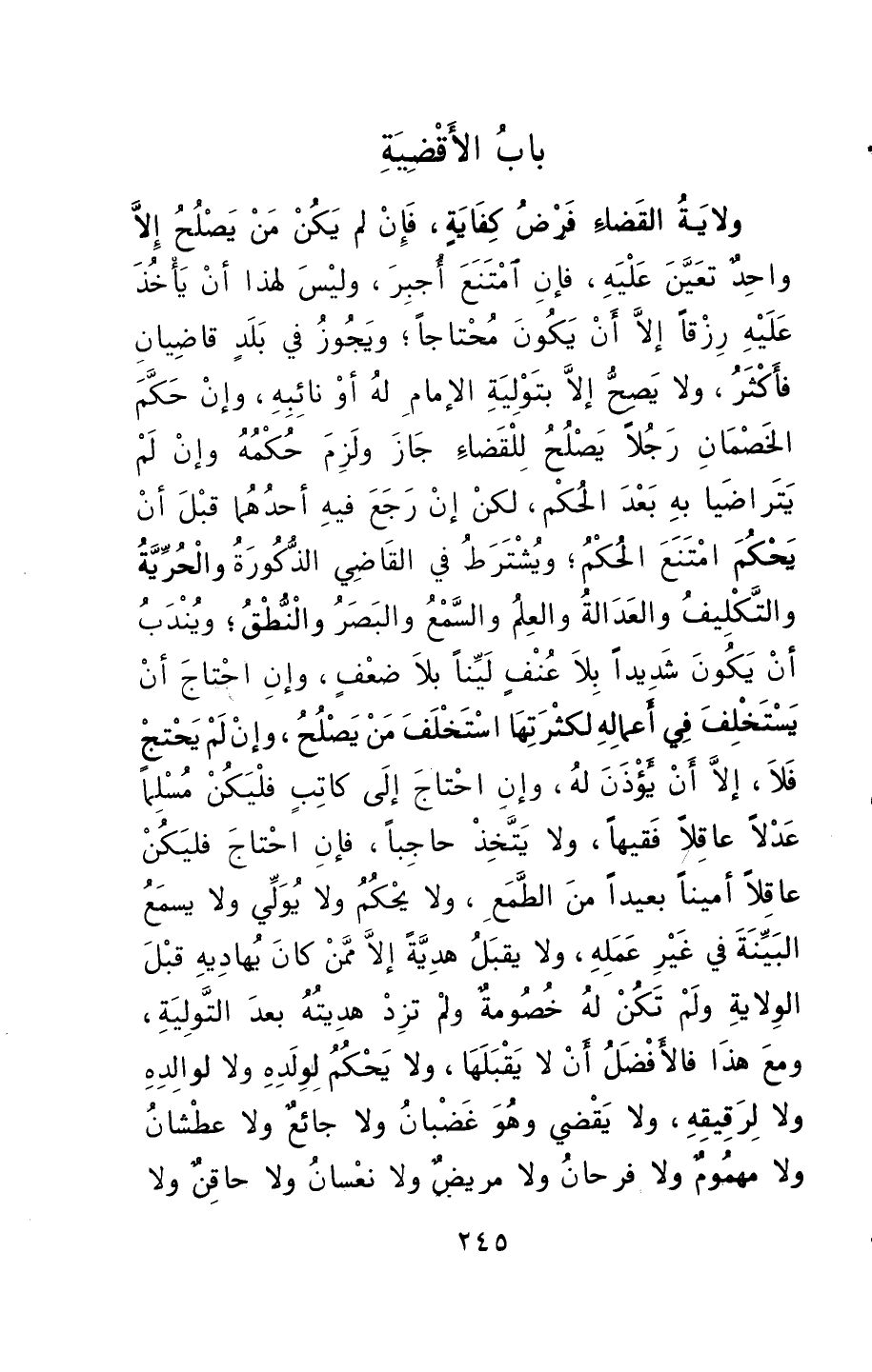 وِلايةُ القَضاءِ فَرْضُ كِفايةٍ، فإنْ لمْ يَكُنْ منْ يَصْلُحُ إلاّ واحدٌ تَعَيَّنَ عليهِ، فإن امتنعَ أُجْبِرَ، وليْسَ لهذا أنْ يأخُذَ عليهِ رِزْقاً إلاّ أنْ يكونَ مُحتاجاً. ويجوزُ في بلدٍ قاضِيانِ فأكثَرُ، ولا يَصِحُّ إلاّ بتوْلِيَةِ الإمامِ لهُ أو نائبِهِ.