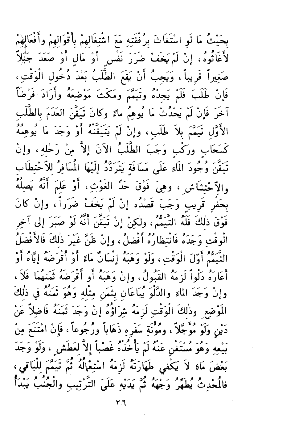 وإن تيقن وجود الماء على مسافة يتردد إليها المسافر للاحتطاب والاحتشاش -وهي فوق حد الغوث- أو علم أنه يصله بحفرٍ قريب، وجب قصده إن لم يخف ضرراً، وإن كان فوق ذلك فله التيمم.