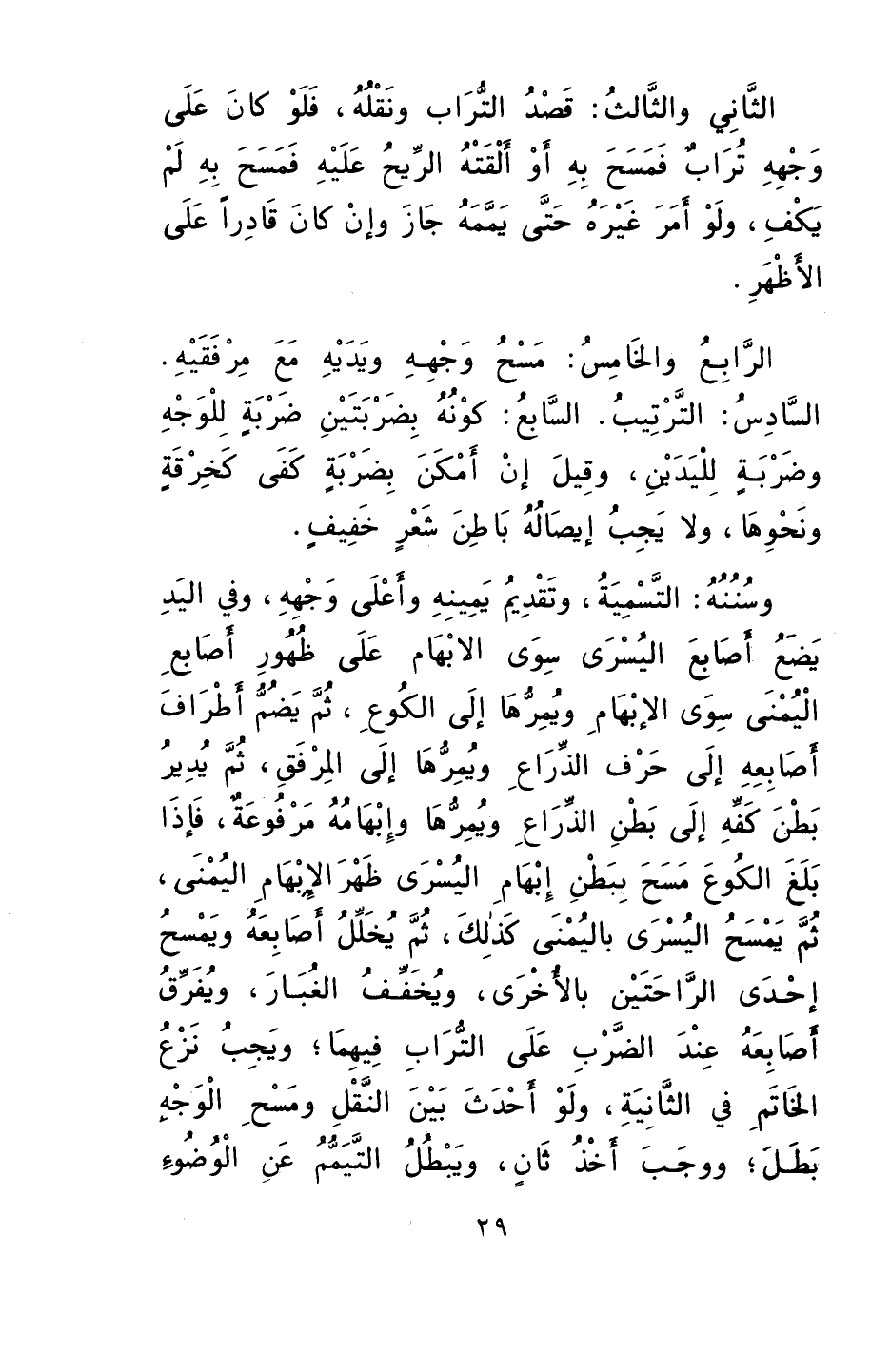 وفي اليد: يضع أصابع اليسرى -سوى الإبهام- على ظهور أصابع اليمنى سوى الإبهام ويمرها إلى الكوع، ثم يضم أطراف أصابعه إلى حرف الذراع ويمرها إلى المرفق، ثم يدير بطن كفه إلى بطن الذراع ويمرها وإبهامه مرفوعة، فإذا بلغ الكوع مسح ببطن إبهام اليسرى ظهر إبهام اليمنى، ثم يمسح اليسرى باليمنى كذلك، ثم يخلل أصابعه، ويمسح إحدى الراحتين بالأخرى.