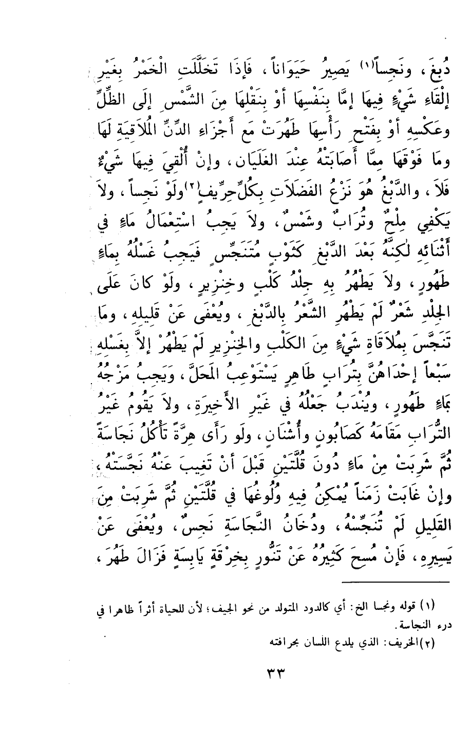 ولا يجب استعمال ماء في أثنائه، لكنه بعد الدبغ كثوب متنجّس، فيجب غسله بماء طهور. ولا يطهر بالدبغ جلد كلب وخنزير.
