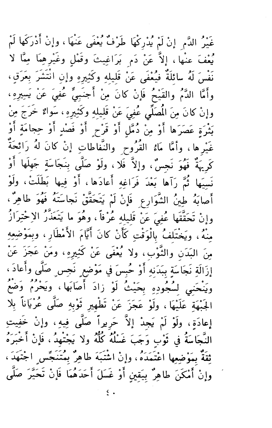 -غير الدم- إن لم يدركها طرْفٌ يُعْفَ عنها، وإن أدركها لم يعف عنها، إلا عن دم براغيث وقمل وغيرهما، مما لا نفس له سائلة، فيعفى عن قليله وكثيره، وإن انتشر بعرق. وأما الدم والقيح: فإن كان من أجنبي عُفي عن يسيره، وإن كان من المصلي عفي عن قليله وكثيره، سواء خرج من بَثْرَة عصرها أو من دُمَّلٍ أو من قَرْح أو فصْد أو حجامة أو غيرها.
