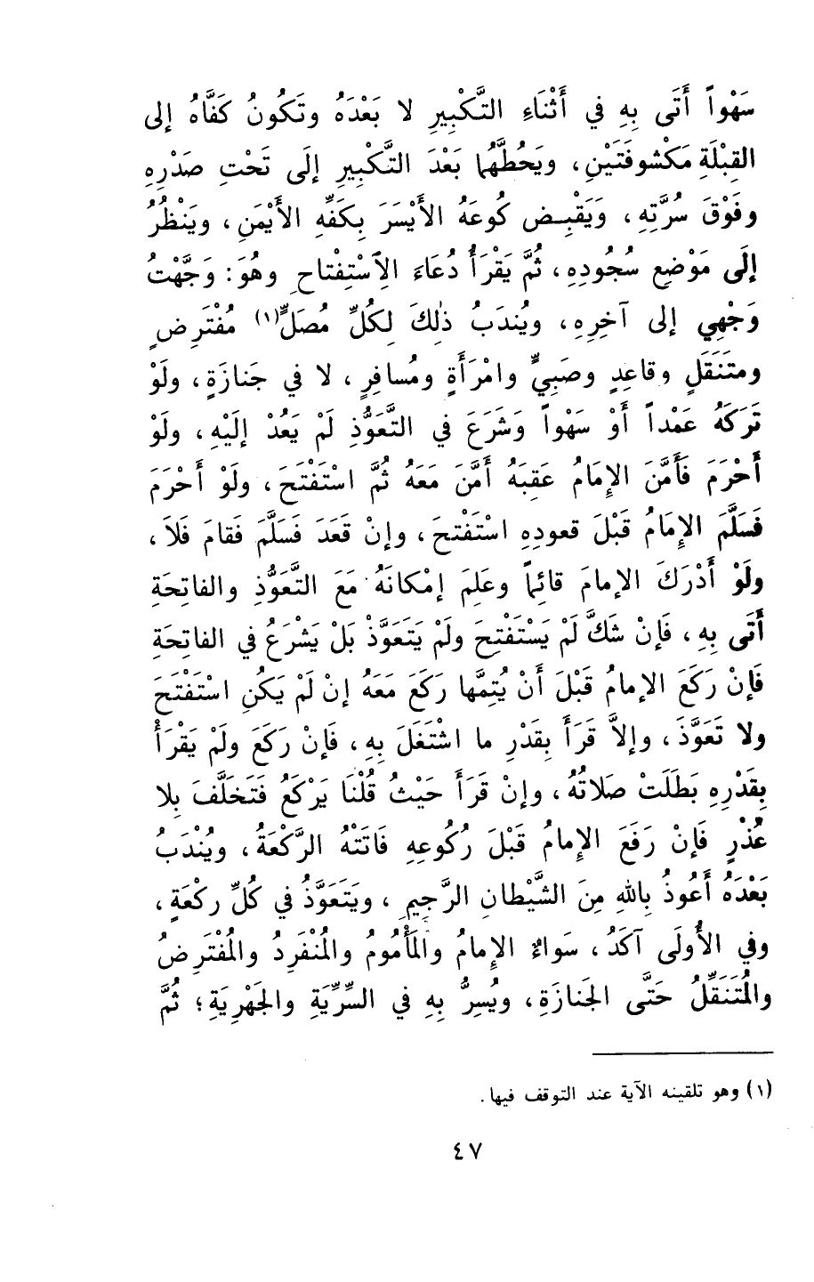 ويندب بعده: أعوذ بالله من الشيطان الرجيم، ويتعوذ في كل ركعة، وفي الأولى آكد، سواء الإمام والمأموم والمنفرد، والمفترض والمتنفل حتى الجنازة، ويُسرُّ به في السرِّية والجهرية. [الركن الثالث: قراءة الفاتحة]: