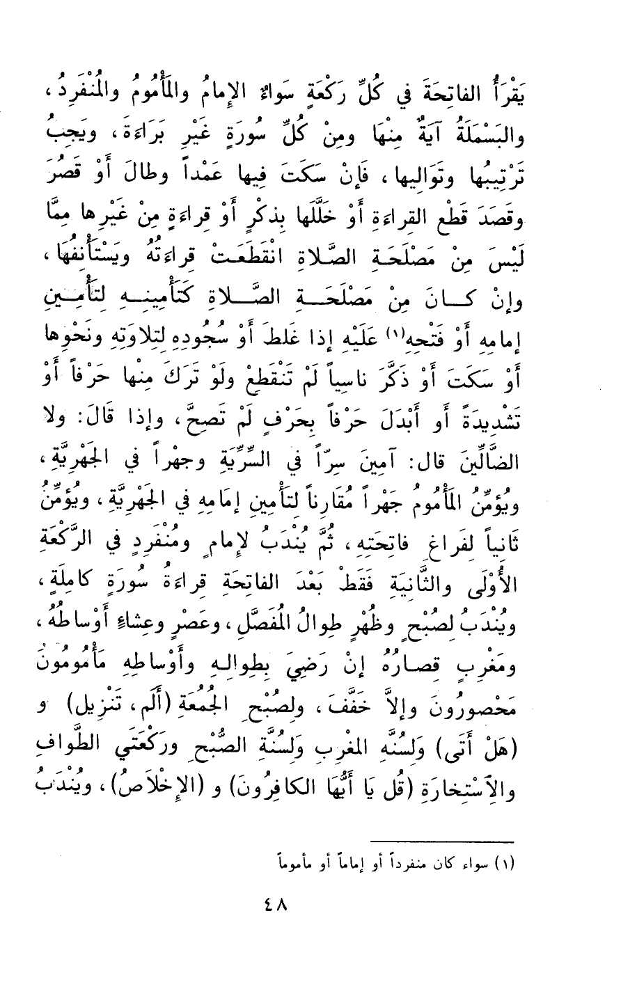 يقرأ الفاتحة في كل ركعة، سواء الإمام والمأموم والمنفرد، والبسملة آية منها ومن كل سورة غير براءة.