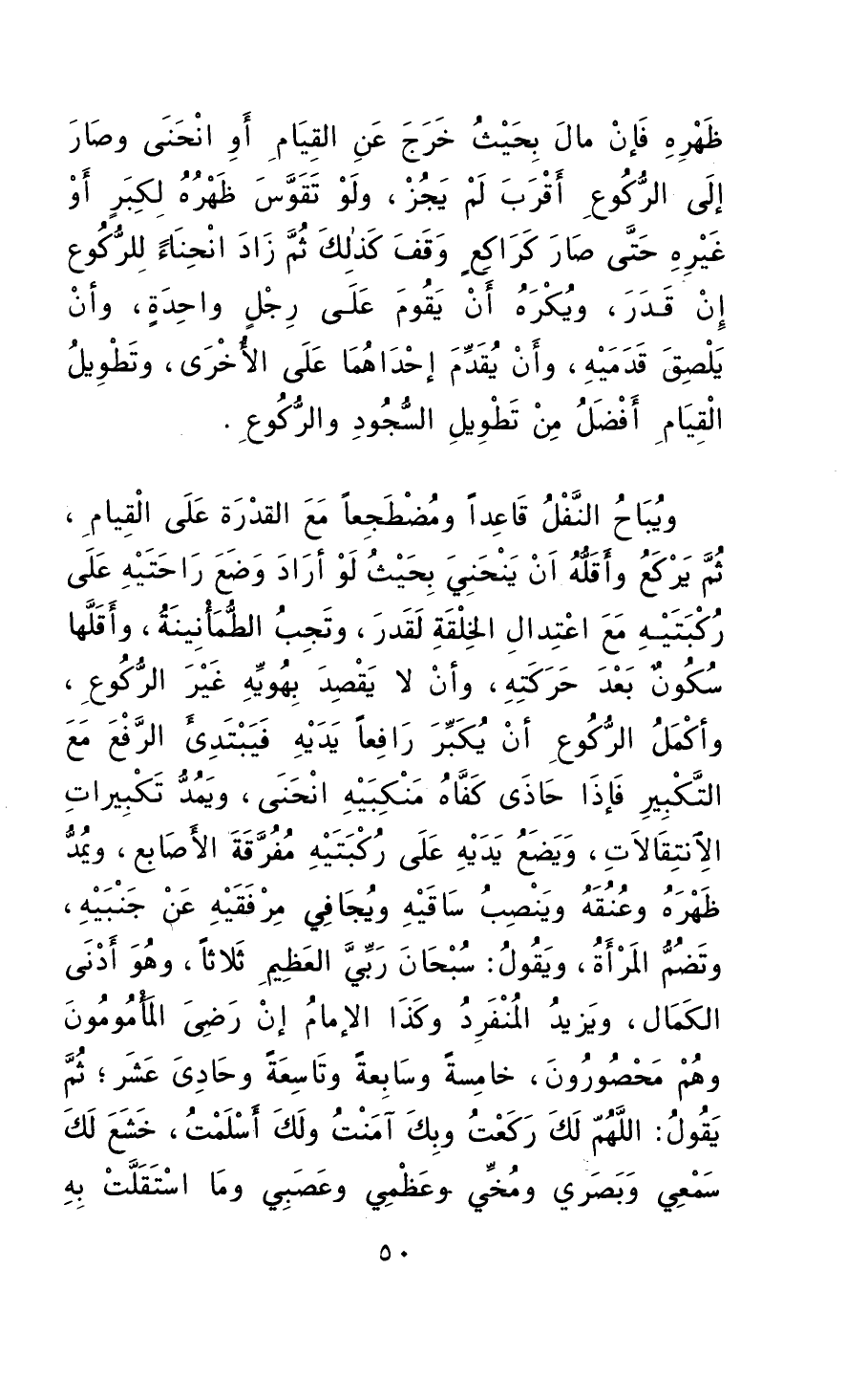 وأكمل الركوع: أن يكبر رافعاً يديه، فيبتدئ الرفع مع التكبير، فإذا حاذى كفَّاه منكبيه انحنى، ويَمُدُّ تكبيرات الانتقالات، ويضع يديه على ركبتيه مفرقة الأصابع، ويَمُدُّ ظهره وعنقه، وينصب ساقيه، ويجافي مِرْفَقَيْه عن جنبيه، وتضم المرأة، ويقول: سبحان ربي العظيم، ثلاثاً، وهو أدنى الكمال، ويزيد المنفرد وكذا الإمام -إن رضي المأمومون وهم محصورون- خامسة وسابعة وتاسعة وحادي عشر، ثم يقول: "اللهم لك ركعت، وبك آمنت، ولك أسلمت، خشع لك سمعي وبصري ومخي وعظمي وعصبي وشعري وبشري وما استقلت به