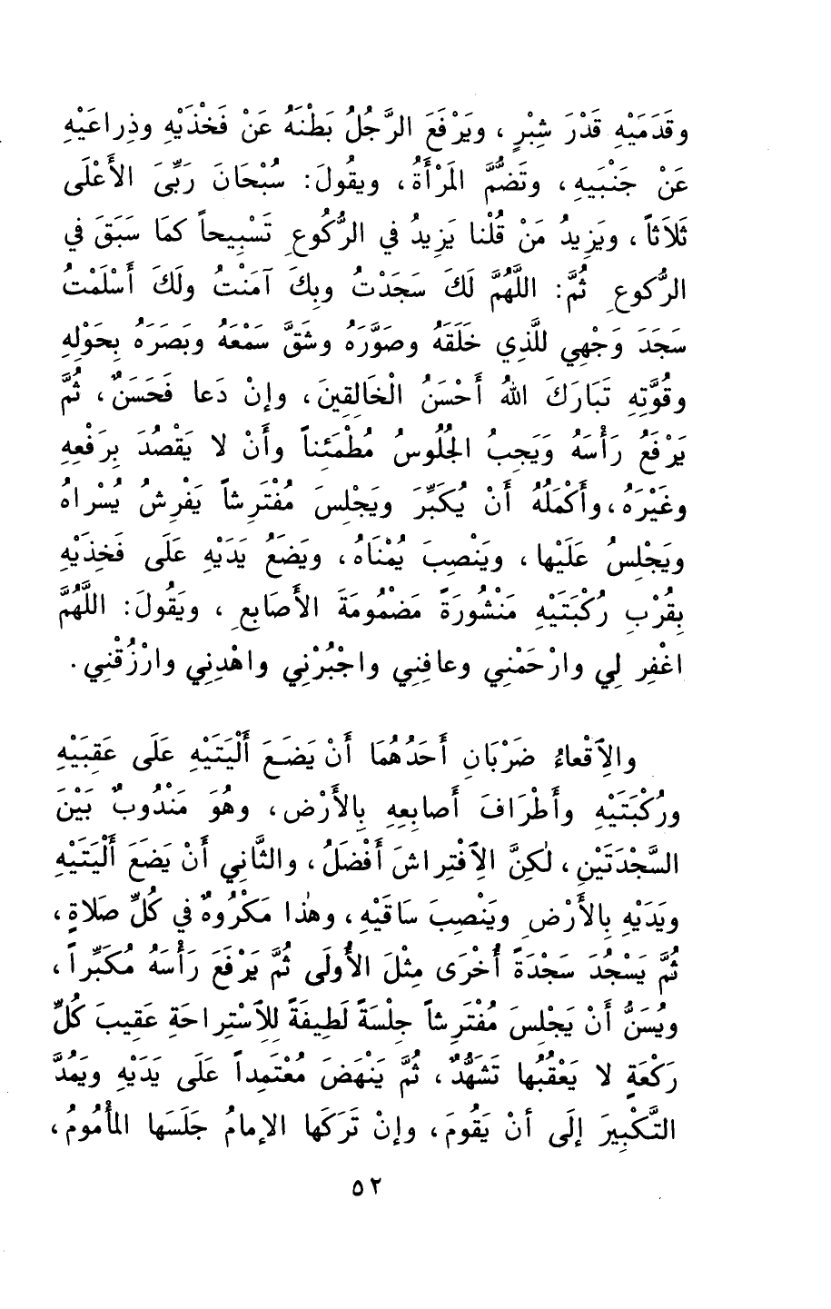 وقدميه قدر شبر، ويرفع الرجل بطنه عن فخذيه وذراعيه عن جنبيه، وتضم المرأة. ويقول: "سبحان ربي الأعلى وبحمده"، ثلاثاً، ويزيد مَنْ قلنا يزيد في الركوع تسبيحاً كما سبق في الركوع، ثم: "اللهم لك سجدت، وبك آمنت، ولك أسلمت، سجد وجهي للذي خلقه وصوره وشق سمعه وبصره بحوله وقوته، تبارك الله أحسن الخالقين". وإن دعا فحسن.