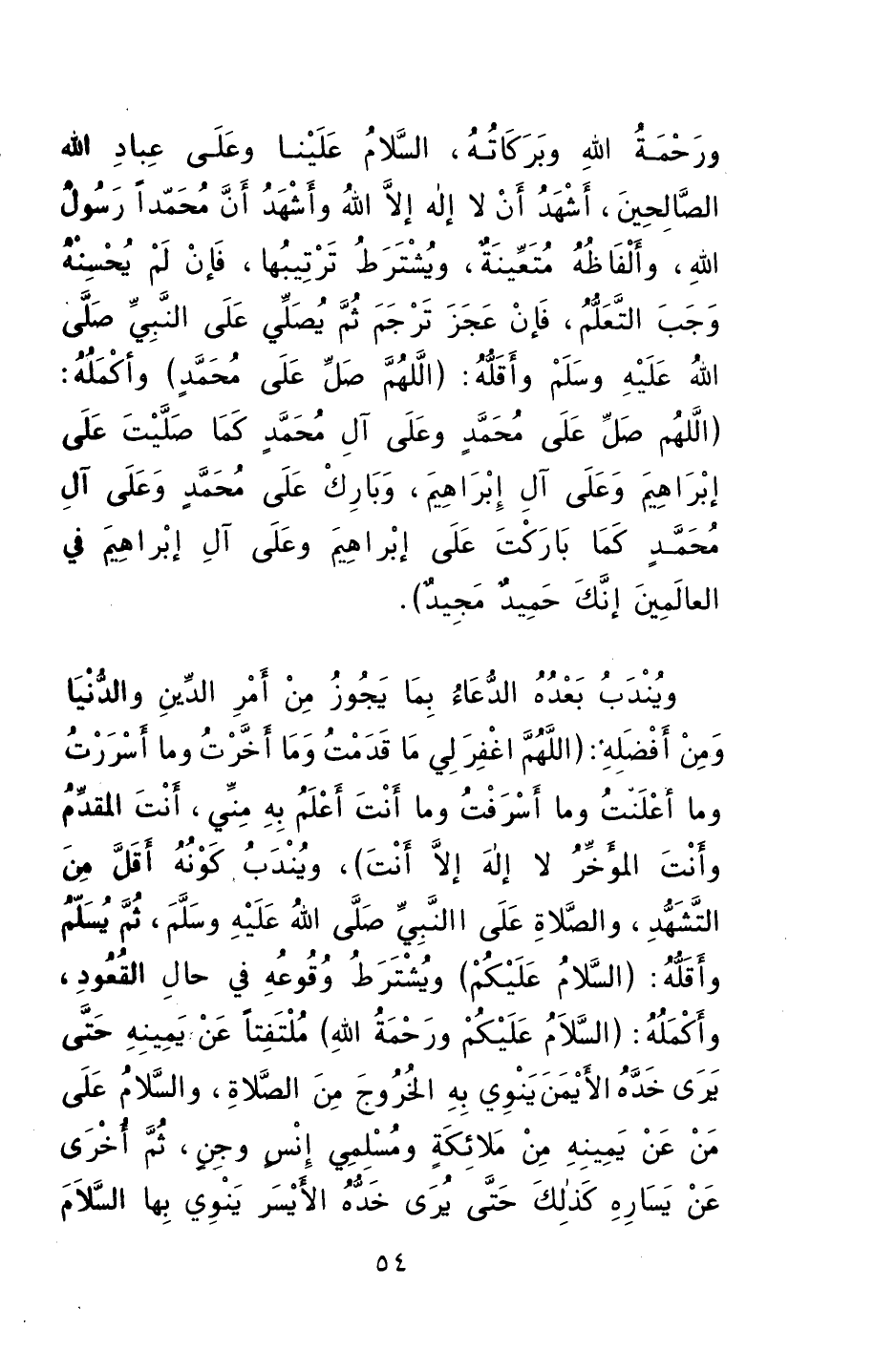 وأكمله: "السلام عليكم ورحمة الله"، ملتفتاً عن يمينه حتى يُرى خده الأيمن، ينوي به الخروج من الصلاة، والسلام على من عن يمينه من ملائكة ومسلمي إنس وجن. ثم أخرى عن يساره كذلك حتى يرى خده الأيسر، ينوي بها السلام