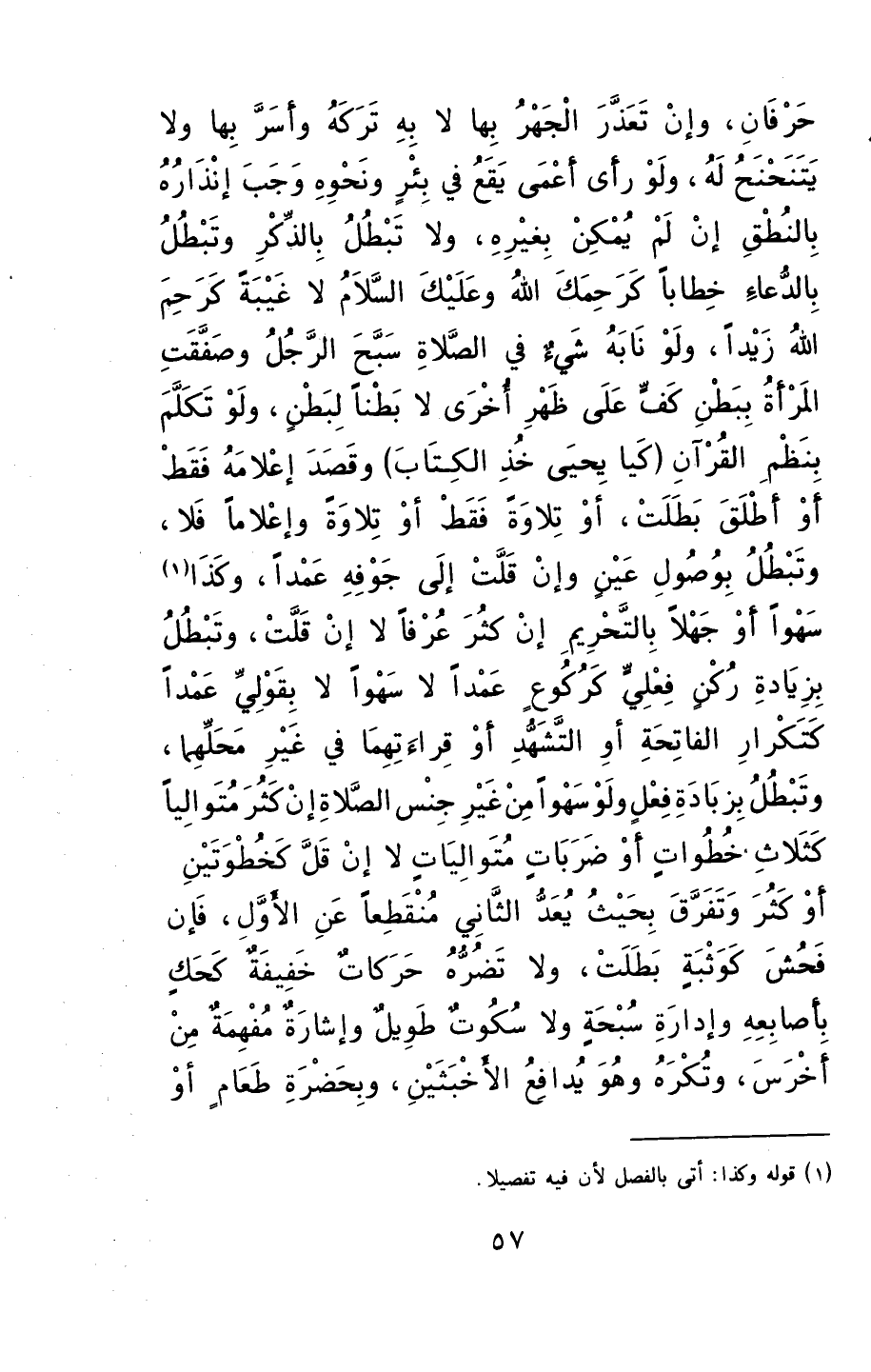 [ب- الحركة من غير جنس الصلاة]: وتبطل الصلاة بزيادة فعل -ولو سهواً- من غير جنس الصلاة إن كثر متوالياً، كثلاث خطوات أو ضربات متواليات. لا إنْ قلَّ، كخطوتين، أو كثُر وتفرق بحيث يعد الثاني منقطعاً عن الأول، فإن فحُش -كوثبة- بطلت.