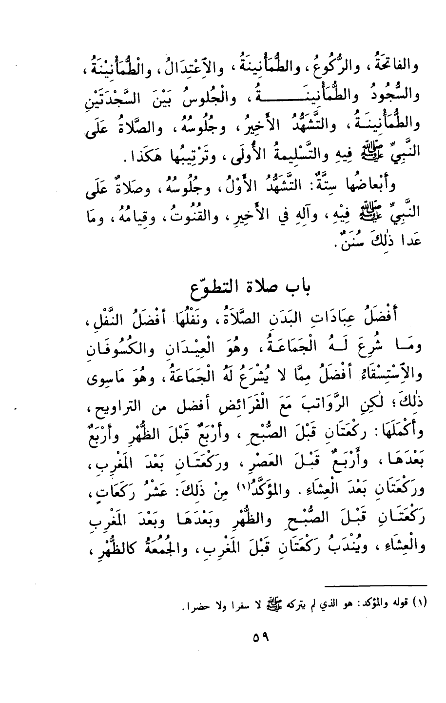 أفضل عبادات البدن الصلاة، ونفلها أفضل النفل. وما شرع له الجماعة -وهو: العيدان والكسوفان والاستسقاء- أفضل مما لا يشرع له الجماعة، وهو ما سوى ذلك، لكن الرواتب مع الفرائض أفضل من التراويح. والسنة أن يواظب على رواتب الفرائض، وأكملها: ركعتان قبل الصبح، وأربعٌ قبل الظهر وأربعٌ بعدها، وأربعٌ قبل العصر، وركعتان بعد المغرب، وركعتان بعد العشاء.