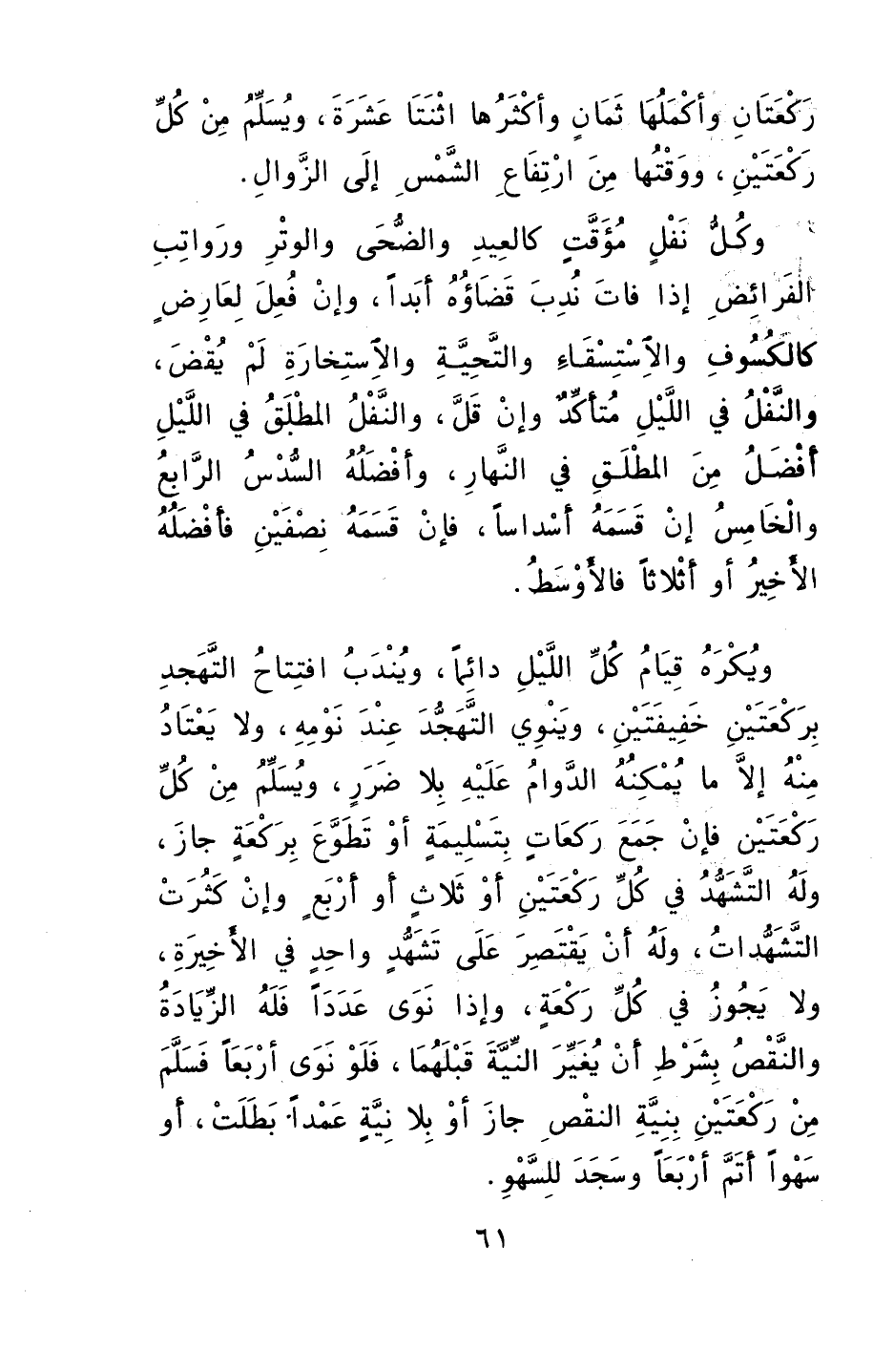 والنفل في الليل متأكدٌ وإن قلَّ، والنفل المطلق في الليل أفضل من المطلق في النهار، وأفضله السدس الرابع والخامس إن قسمه أسداساً، فإن قسمه نصفين فأفضله الأخير، أو أثلاثاً فالأوسط.