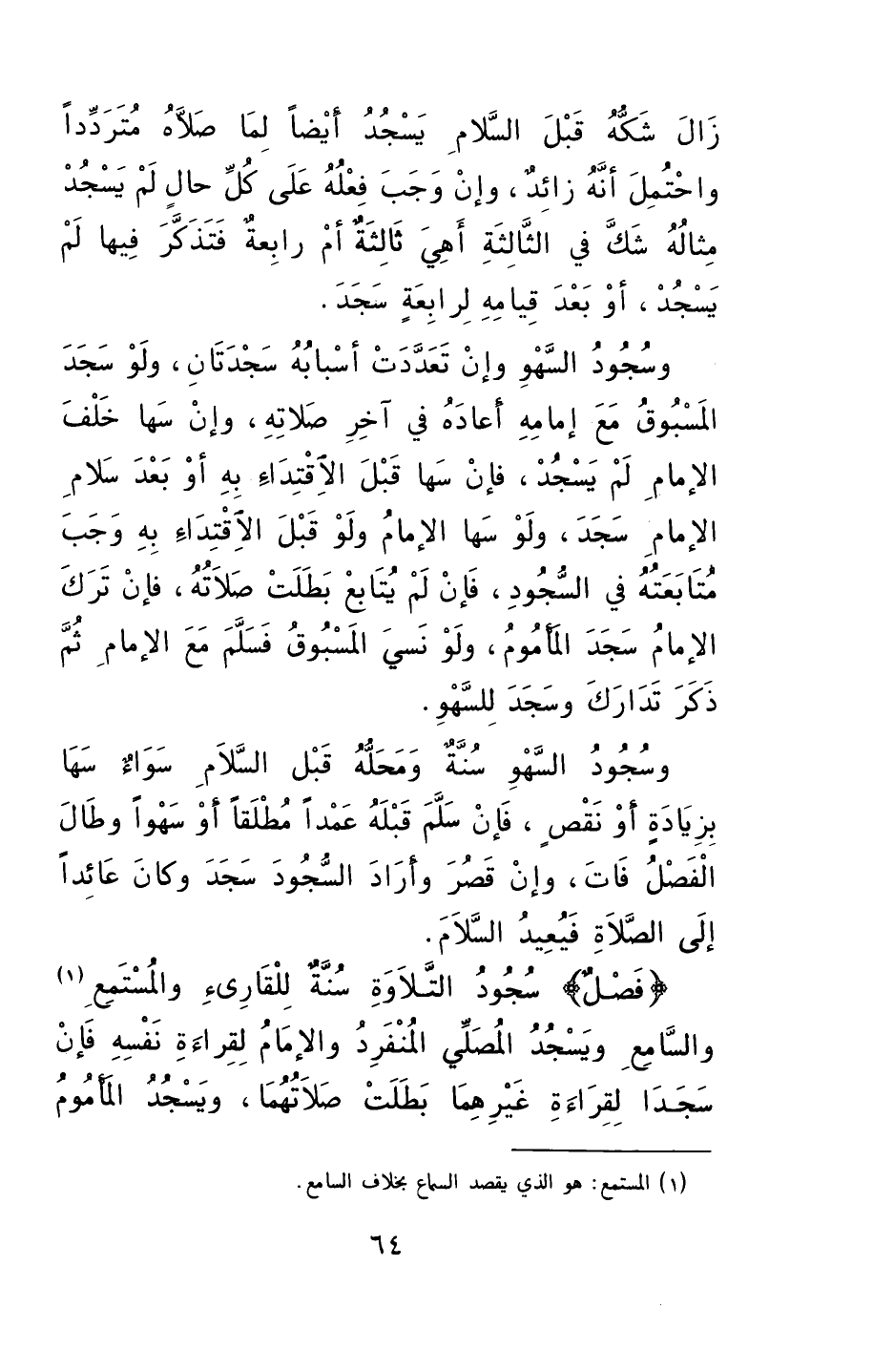 وسجود السهو سنة، ومحله قبل السلام: سواء سها بزيادة أو نقص، فإن سلَّم قبله عمداً مطلقاً -أو سهواً وطال الفصل- فات، وإن قصُر وأراد السجود سجد، وكان عائداً إلى الصلاة، فيعيد السلام.
