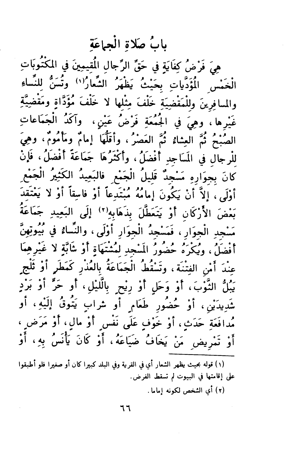 وأقلُّ الجماعة إمامٌ ومأمومٌ، وهيَ للرجالِ في المساجدِ أفضلُ، وأكثرُها جماعةً أفضلُ، فإنْ كانَ بجوارِهِ مسجدٌ قليلُ الجمعِ فالبعيدُ الكثيرُ الجمعِ أولى، إلا أنْ يكونَ إمامُهُ مبتدعاً، أوْ فاسقاً، أوْ لا يعتقد بعض الأركانِ، أوْ يتعطلَ بذهابهِ إلى البعيدِ جماعةُ مسجدِ الجوارِ فمسجدُ الجوارِ أولى، والنساءُ في بيوتهنَّ أفضلُ، ويُكرهُ حضورُ المسجدِ لمشتهاةٍ أوْ شابَّةٍ، لا غيرِهِما عندَ أمنِ الفتنةِ.