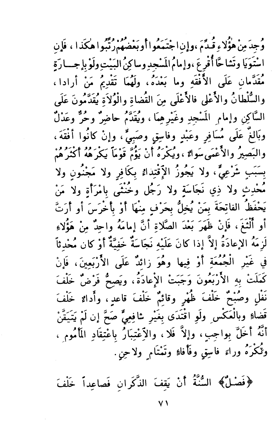 ويُقدَّمُ حاضرٌ وحرٌّ وعدلٌ وبالغٌ على مسافرٍ وعبدٍ وفاسقٍ وصبيٍّ، وإنْ كانوا أفقهَ. والبصيرُ والأعمى سواءٌ.