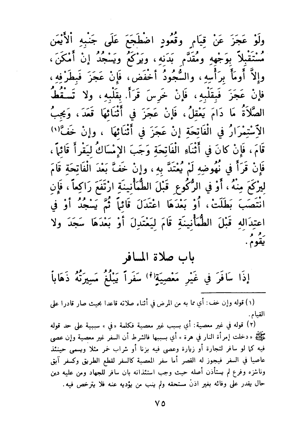 ولوْ عَجَزَ عنْ قيامٍ وقعودٍ اضطجعَ على جنبهِ الأيمن مستقبلاً بوجههِ ومُقدَّمِ بدنهِ، ويركعُ ويسجدُ إنْ أمكنَ، وإلا أومأ برأسهِ، والسجودُ أخفضُ، فإنْ عجزَ فبطرفهِ، فإنْ عجزَ فبقلبهِ، فإنْ خرَسَ قرأَ بقلبهِ. ولا تسقطُ الصلاةُ ما دامَ يعقلُ. فإنْ عجزَ في أثنائها قعدَ، ويجبُ الاستمرارُ في الفاتحةِ إنْ عجزَ في أثنائها، وإنْ خفَّ قام، فإنْ كانَ في أثناء الفاتحةِ وجبَ الإمساكُ ليقرأَ قائماً، فإنْ قرأَ في نهوضهِ لمْ يعتدَّ بهِ، وإنْ خفَّ بعدَ الفاتحةِ قام ليركعَ منهُ، أو في الركوعِ قبلَ الطمأنينةِ ارتفعَ راكعاً، فإنْ انتصبَ بطلت، أوْ بعدها اعتدلَ قائماً ثمَّ يسجدُ، أوْ في اعتدالهِ قبلَ الطمأنينةِ قامَ ليعتدلَ، أو بعدَها سجدَ ولا يقومُ.