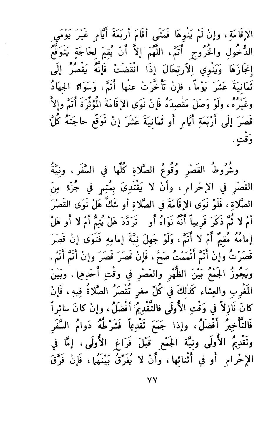 الإقامةِ وإن لم ينوها، فمتى أقامَ أربعةَ أيامٍ غيرَ يومي الدخولِ والخروجِ أتمَّ، اللهمَّ إلا أنْ يقيمَ لحاجةٍ يتوقعُ نجازَها وينوي الارتحالَ إذا انقضتْ، فإنهُ يقصُرُ إلى ثمانيةَ عشَرَ يوماً، فإنْ تأخرَتْ عنها أتمَّ، وسواءٌ الجهادُ وغيرُهُ.