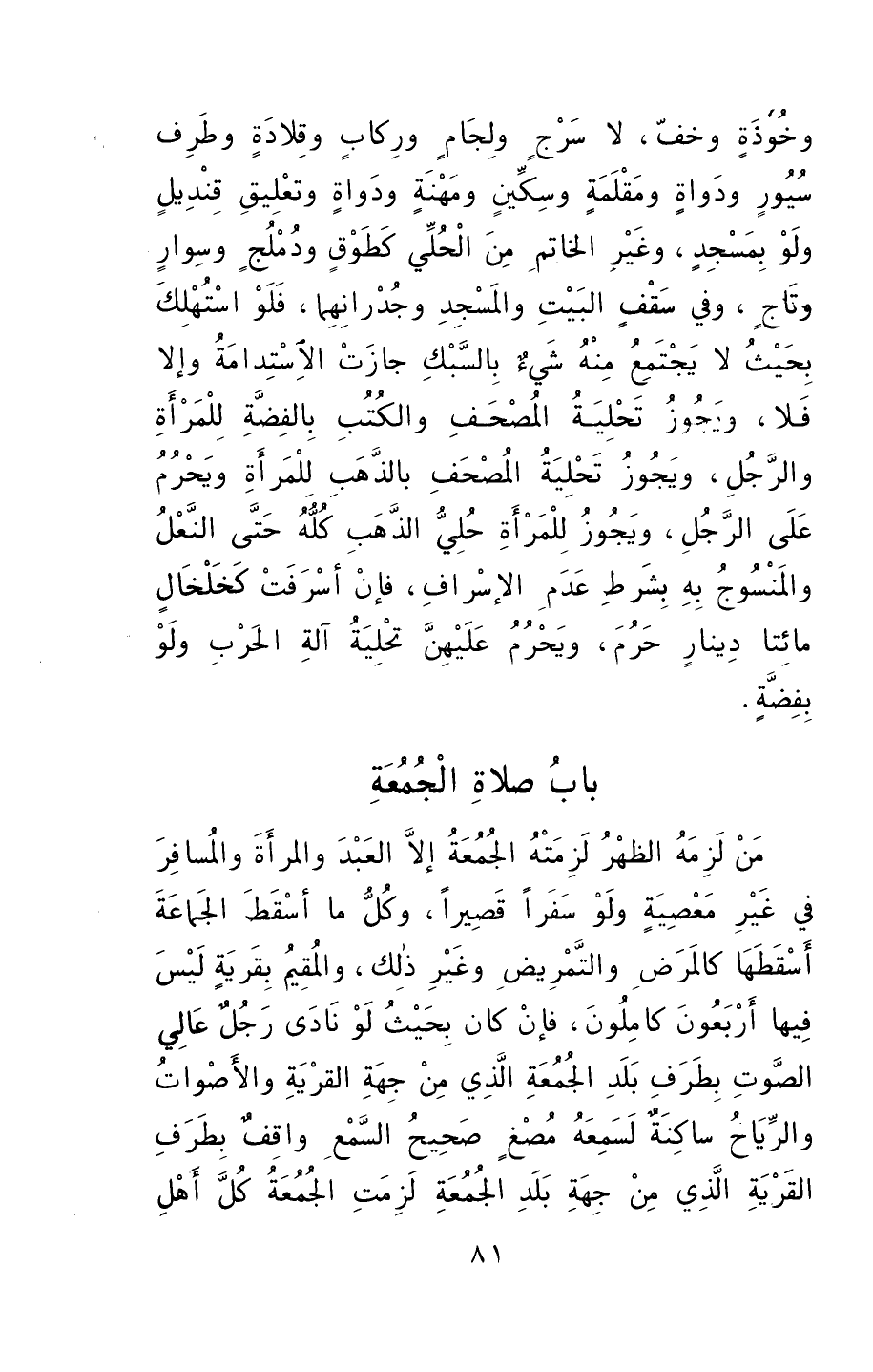 ويجوزُ للمرأةِ حليُّ الذهبِ كلُّهُ حتى النعْلُ، والمنسوجُ بهِ، بشرطِ عدمِ الإسرافِ، فإنْ أسرفتْ كخَلخالٍ مئتا دينارٍ حرُمَ، ويحرُمُ عليهنَّ تحليةُ آلةِ الحربِ ولوْ بفضةٍ. بابُ صلاةِ الجمعةِ