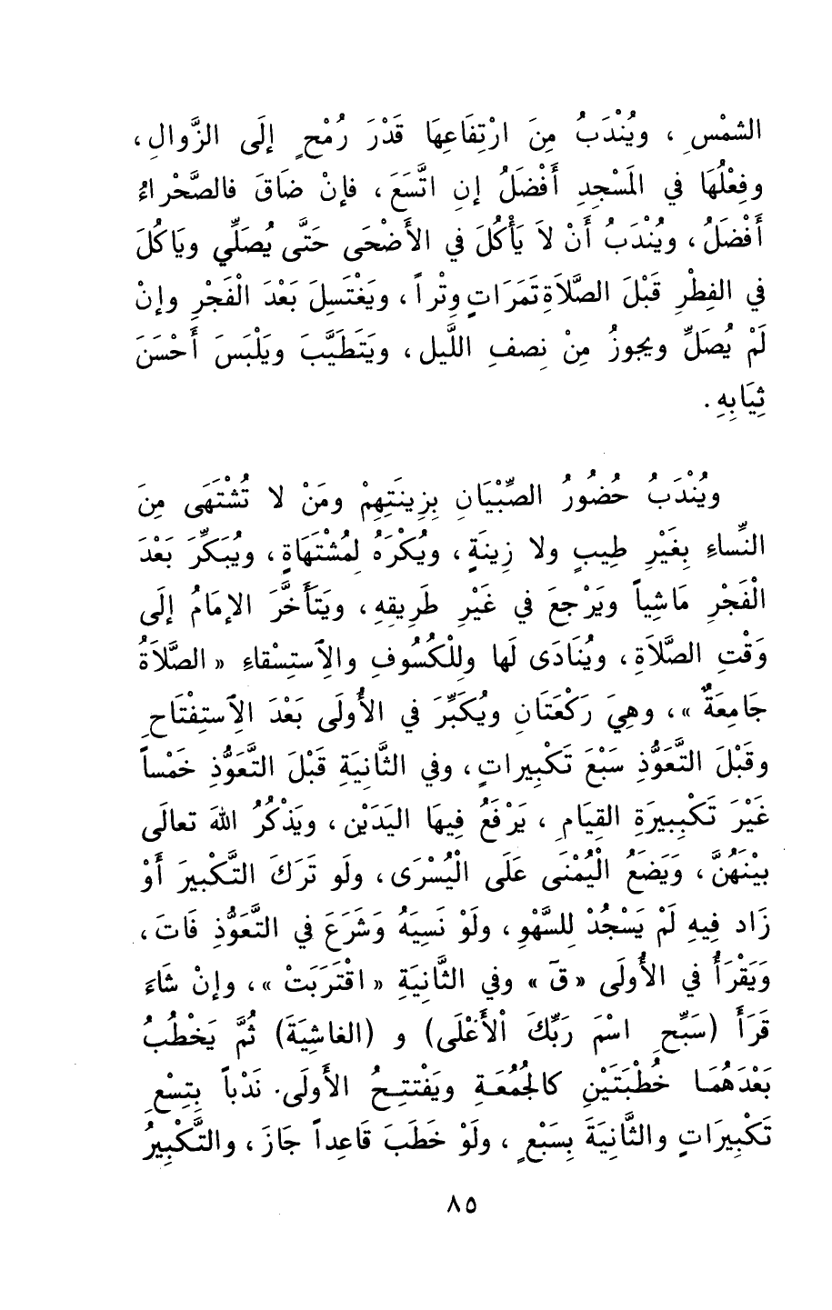 الشمسِ، ويندبُ من ارتفاعها قدرَ رمحٍ إلى الزوالِ، وفعلُها في المسجدِ أفضلُ إن اتسعَ، فإنْ ضاقَ فالصحراءُ أفضلُ، ويندبُ أنْ لا يأكلَ في الأضحى حتى يصلي، ويأكلَ في الفطرِ قبلَ الصلاةِ تمراتٍ وتراً، ويغتسلَ بعدَ الفجِر وإنْ لمْ يصلِّ، ويجوزُ منْ نصفِ الليلِ، ويتطيبَ ويلبسَ أحسنَ ثيابهِ.