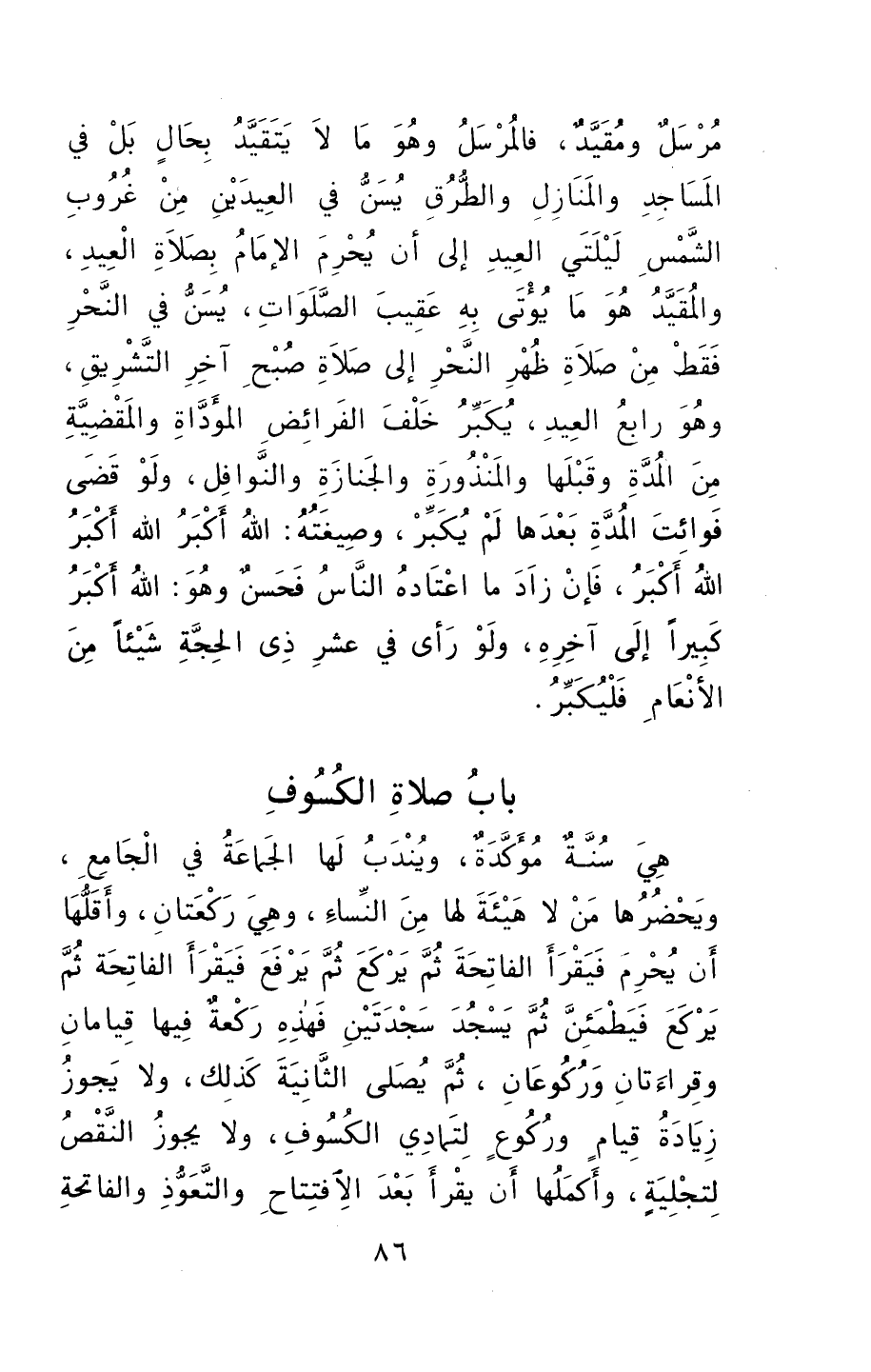 والمُقيَّدُ: هوَ ما يؤتى به عقيب الصلواتِ، يسنُّ في النحرِ فقطْ منْ صلاةِ ظهرِ النحرِ إلى صلاةِ صبحِ آخرِ التشريقِ وهوَ رابعُ العيدِ، يكبرُ خلفَ الفرائضِ المؤدَّاةِ والمقضيةِ، مِنَ المدةِ وقبلها، والمنذورةِ والجنازةِ والنوافلِ، ولوْ قضى فوائتَ المدةِ بعدها لمْ يكبّر.