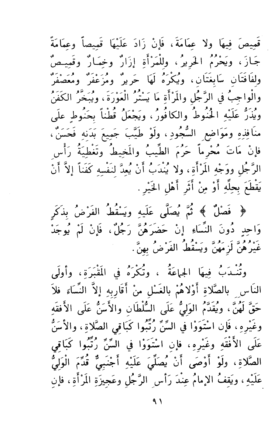 قميصَ فيها ولا عمامةً، فإنْ زادَ عليها قميصاً وعمامةً جازَ، ويحرمُ الحريرُ، وللمرأةِ إزارٌ وخمارٌ وقميصٌ ولفافتانِ سابغتانِ، ويُكرهُ لها حريرٌ ومزعفرٌ ومعصفرٌ، والواجبُ في الرجلِ والمرأةِ ما يسترُ العورةَ.