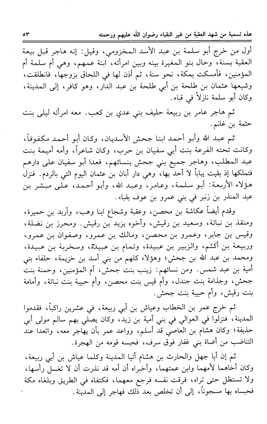 فوجدوا البلاء والأذى على المسلمين الذين بمكة. فبقوا صابرين على الأذى إلى أن هاجروا إلى المدينة. حاشا السكران بن عمرو، فإنه مات بمكة قبل أن يهاجر، فتزوج رسول الله صلى الله عليه وسلم زوجته سودة بنت زمعة؛ وحاشا سلمة بنت هشام، فإنه حبسه عمه وأخوه حتى ذهبت بدر وأحد والخندق؛ وحاشا عياش بن أبى ربيعة، فإنه هاجر إلى المدينة، فاتبعه أبو جهل والحارث ابن هشام، وهما ابنا عمه وأخواه لأمه، فذكراه سوء حال أمه، فرقت نفسه، فرجع، فثقفوه «1» إلى أن مضت بدر وأحد والخندق، فهاجر حينئذ هو وسلمة بن هشام، والوليد بن الوليد بن المغيرة؛ وحاشا عبد الله ابن سهيل بن عمرو، فإنه حبس إلى أن خرج مع الكفار يوم بدر، فهرب إلى رسول الله صلى الله عليه وسلم.