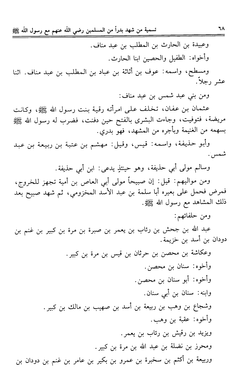 ونزل عبيدة والطفيل والحصين بنو الحارث بن عبد المطلب بن عبد مناف وابن عمهم مسطح بن أثاثة بن عباد بن المطلب بن عبد مناف، وسويبط ابن سعد بن حريملة، أخو بنى عبد الدار، وطليب بن عمير أخو بنى عبد قصى، وخباب بن الأرت مولى عتبة بن غزوان- على عبد الله بن سلمة أخى بنى العجلان بقباء.
