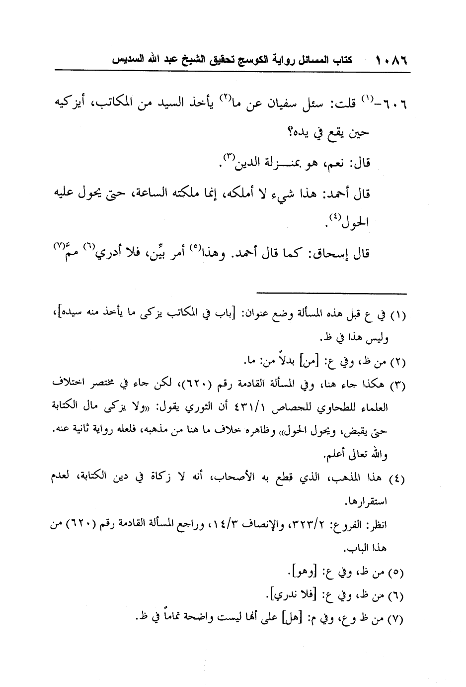3هكذا جاء هنا، وفي المسألة القادمة رقم (620) ، لكن جاء في مختصر اختلاف العلماء للطحاوي للجصاص 1/431 أن الثوري يقول: "ولا يزكى مال الكتابة حتى يقبض، ويحول الحول" وظاهره خلاف ما هنا من مذهبه، فلعله رواية ثانية عنه. والله تعالى أعلم.
