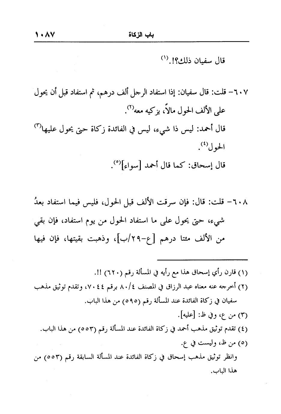 [607 -] قلت: قال سفيان: إذا استفاد الرجل ألف درهم، ثم استفاد قبل أن يحول على الألف الحول مالاً، يزكيه معه2.