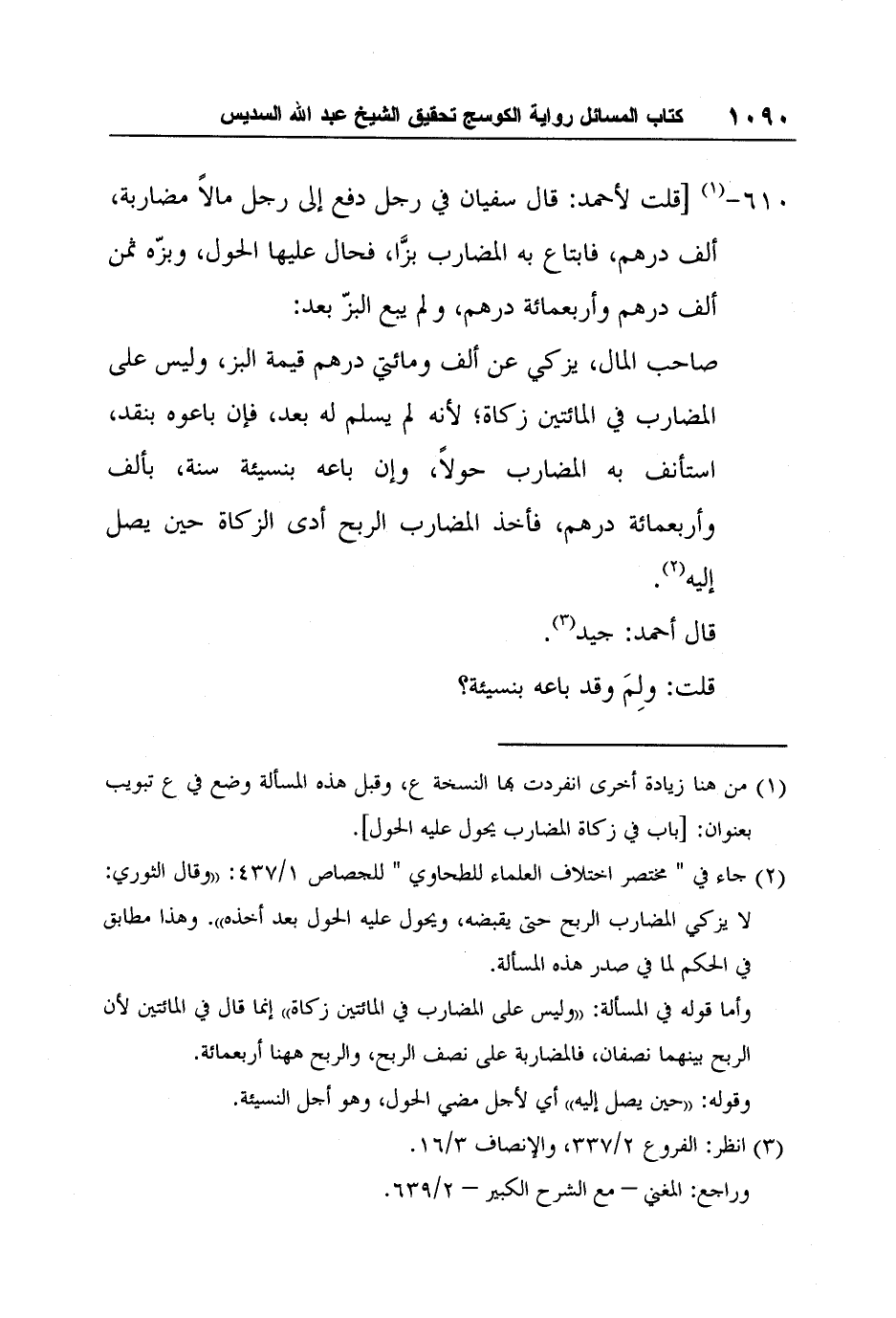 610-1 [قلت لأحمد: قال سفيان في رجل دفع إلى رجل مالاً مضاربة، ألف درهم، فابتاع به المضارب بزَّا، فحال عليها الحول، وبزّه ثمن ألف درهم وأربعمائة درهم، ولم يبع البزّ بعد: