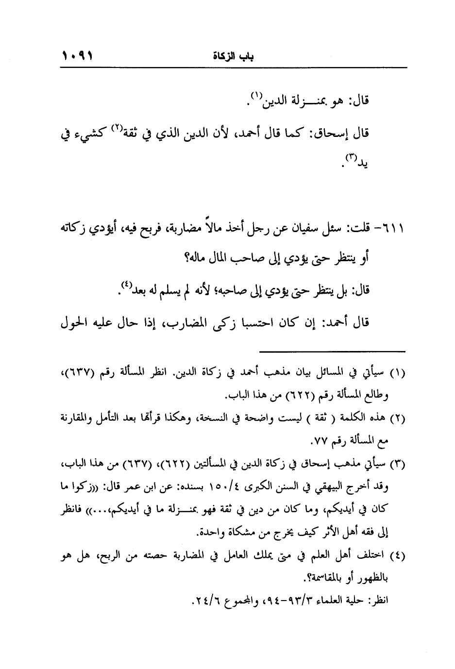3سيأتي مذهب إسحاق في زكاة الدين في المسألتين (622) ، (637) من هذا الباب، وقد أخرج البيهقي في السنن الكبرى 4/150 بسنده: عن ابن عمر قال: "زكوا ما كان في أيديكم، وما كان من دين في ثقة فهو بمنزلة ما في أيديكم،…" فانظر إلى فقه أهل الأثر كيف يخرج من مشكاة واحدة.
