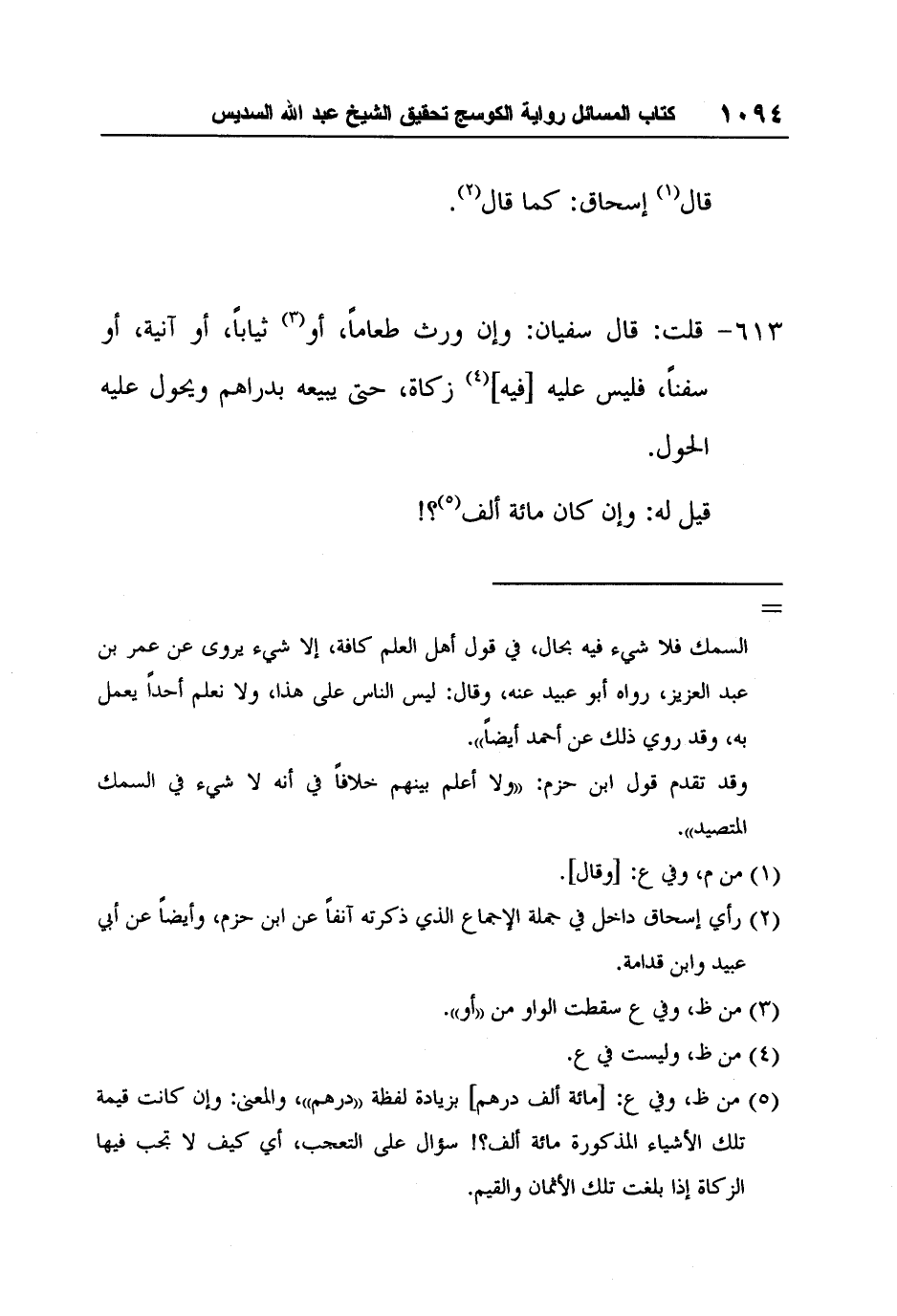 [613 -] قلت: قال سفيان: وإن ورث طعاماً، أو3 ثياباً، أو آنية، أو سفناً، فليس عليه [فيه] 4 زكاة، حتى يبيعه بدراهم ويحول عليه الحول.