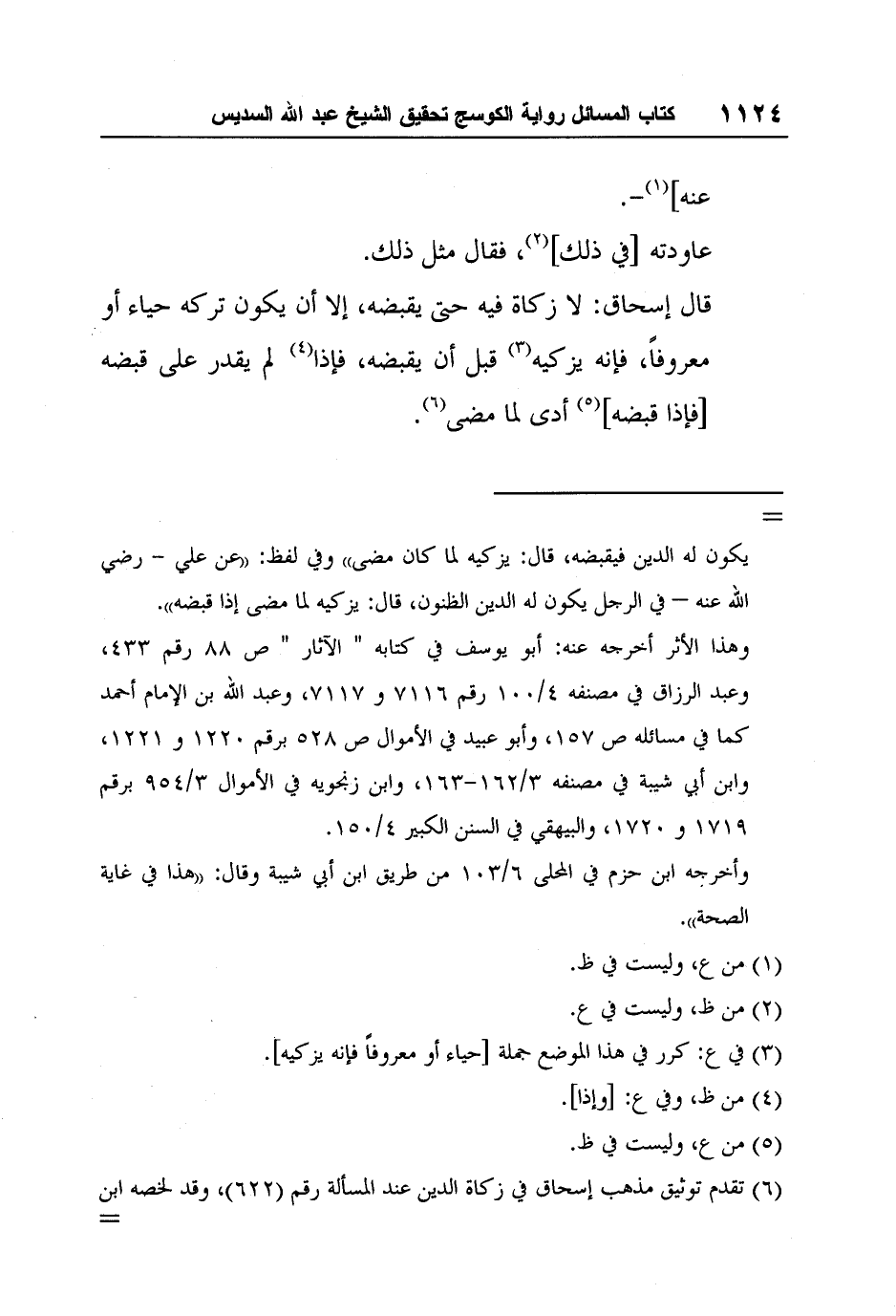 وظاهر أن النوع الأخير يختلف النقل فيه عن إسحاق عمّا ههنا في المسائل، وراجع المصادر الأخرى الموثقة لرأي إسحاق في زكاة الدين التي ذكرت عند المسألة رقم (622) كما تقدم، والله تعالى أعلم.