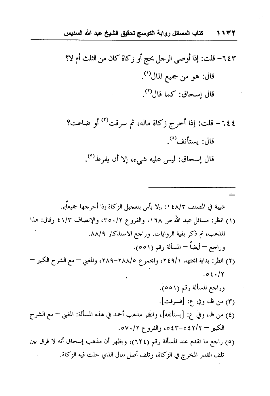 5راجع ما تقدم عند المسألة رقم (624) ، ويظهر أن مذهب إسحاق أنه لا فرق بين تلف القدر المخرج في الزكاة، وتلف أصل المال الذي حلت فيه الزكاة.