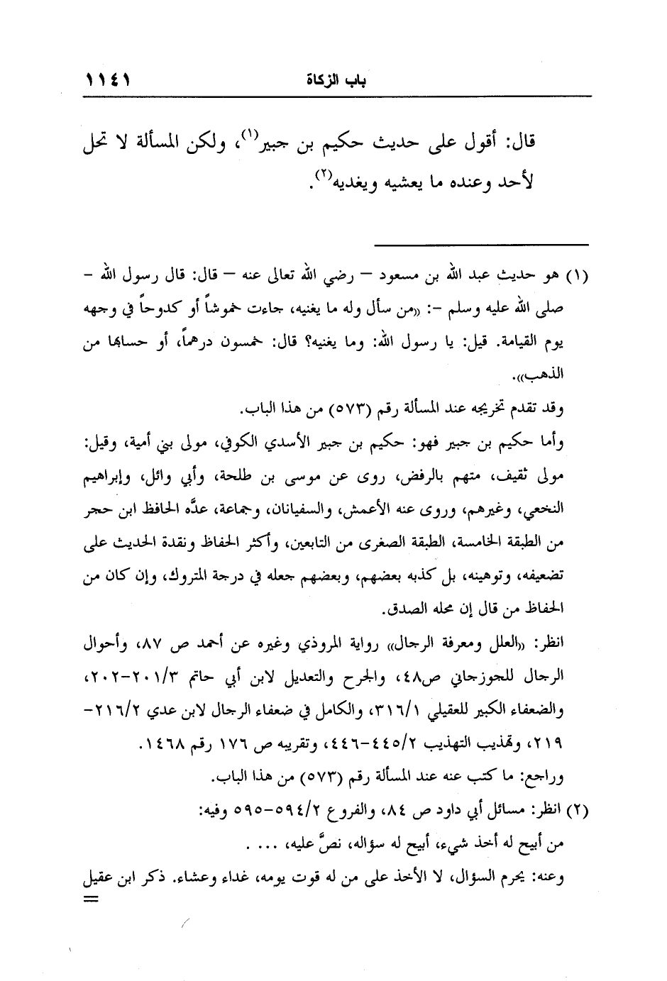 قال: أقول على حديث حكيم بن جبير1، ولكن المسألة لا تحل لأحد وعنده ما يعشيه ويغديه2.