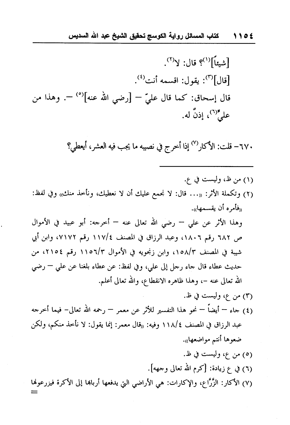 وهذا الأثر عن علي - رضي الله تعالى عنه - أخرجه: أبو عبيد في الأموال ص 682 رقم 1806، وعبد الرزاق في المصنف 4/117 رقم 7172، وابن أبي شيبة في المصنف 3/158، وابن زنجويه في الأموال 3/1156 رقم 2154، من حديث عطاء قال جاء رجل إلى علي، وفي لفظ: عن عطاء بلغنا عن علي - رضي الله تعالى عنه -، وهذا ظاهره الانقطاع، والله تعالى أعلم.