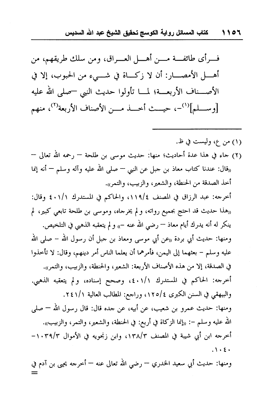 ومنها: حديث أبي بردة "عن أبي موسى ومعاذ بن جبل أن رسول الله - صلى الله عليه وسلم - بعثهما إلى اليمن، فأمرهما أن يعلما الناس أمر دينهم، وقال: لا تأخذوا في الصدقة، إلا من هذه الأصناف الأربعة: الشعير، والحنطة، والزبيب، والتمر".