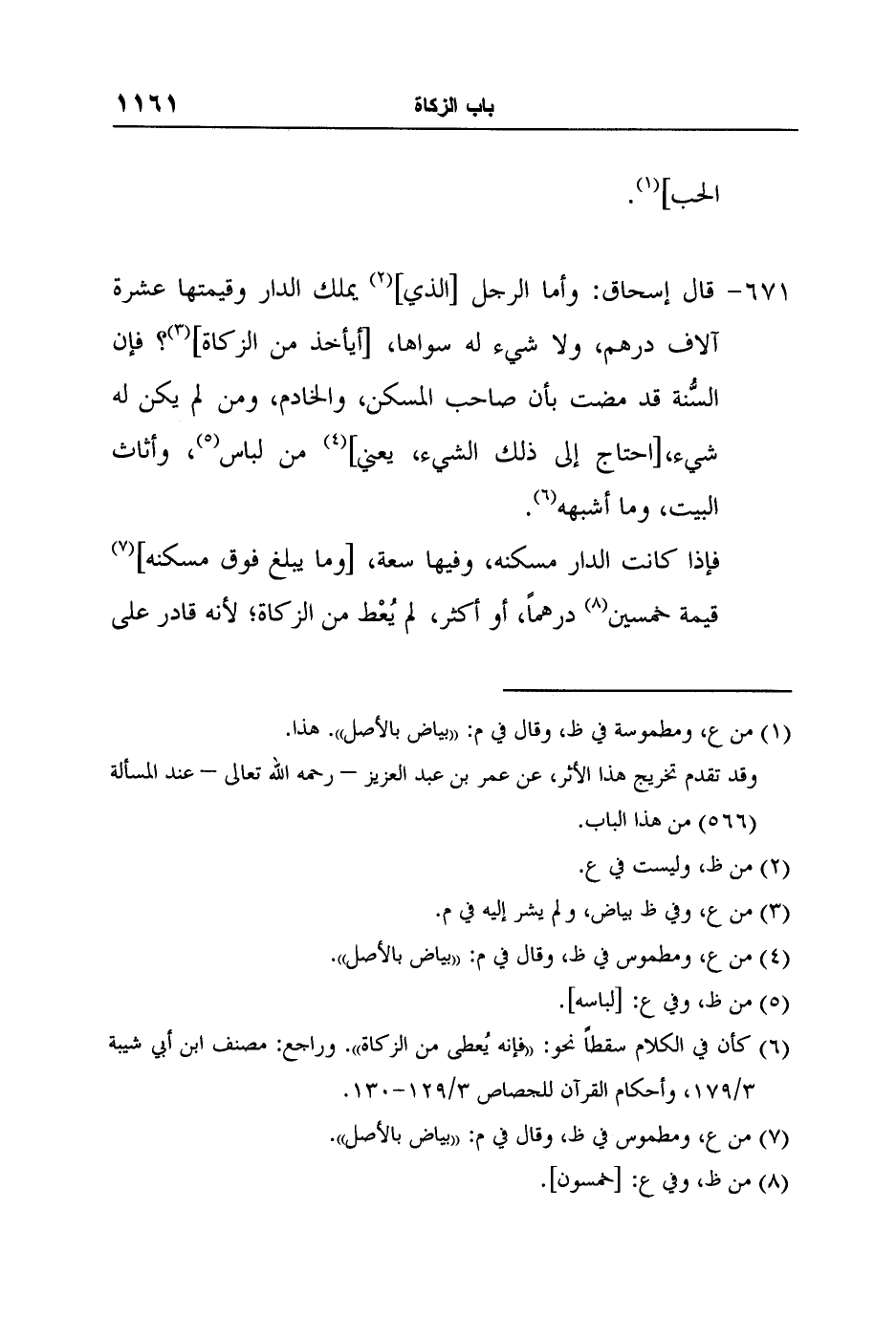 [671 -] قال إسحاق: وأما الرجل [الذي] 2 يملك الدار وقيمتها عشرة آلاف درهم، ولا شيء له سواها، [أيأخذ من الزكاة] 3؟ فإن السُّنة قد مضت بأن صاحب المسكن، والخادم، ومن لم يكن له شيء، [احتاج إلى ذلك الشيء، يعني] 4 من لباس5، وأثاث البيت، وما أشبهه6.