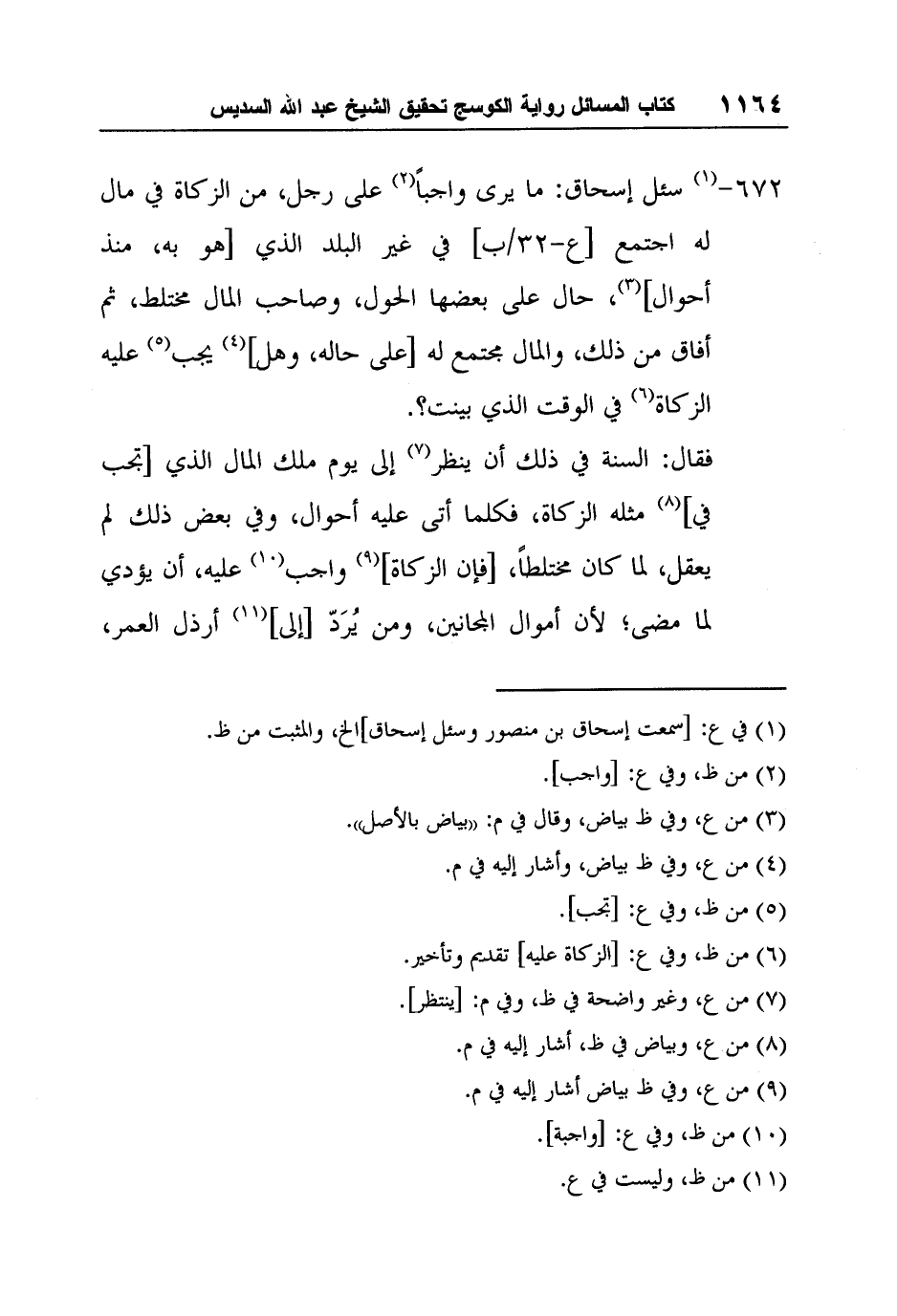672-1 سئل إسحاق: ما يرى واجباً2 على رجل، من الزكاة في مال له اجتمع [ع-32/ب] في غير البلد الذي [هو به، منذ أحوال] 3، حال على بعضها الحول، وصاحب المال مختلط، ثم أفاق من ذلك، والمال مجتمع له [على حاله، وهل] 4 يجب5 عليه الزكاة6 في الوقت الذي بينت؟.