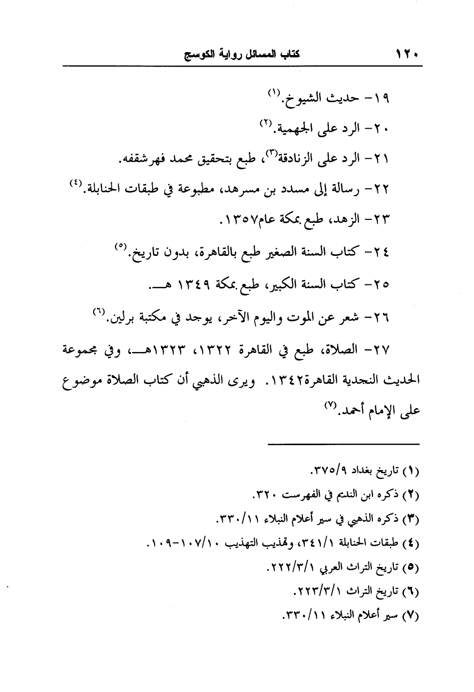 27- الصلاة، طبع في القاهرة 1322، 1323هـ، وفي مجموعة الحديث النجدية القاهرة1342. ويرى الذهبي أن كتاب الصلاة موضوع على الإمام أحمد.7