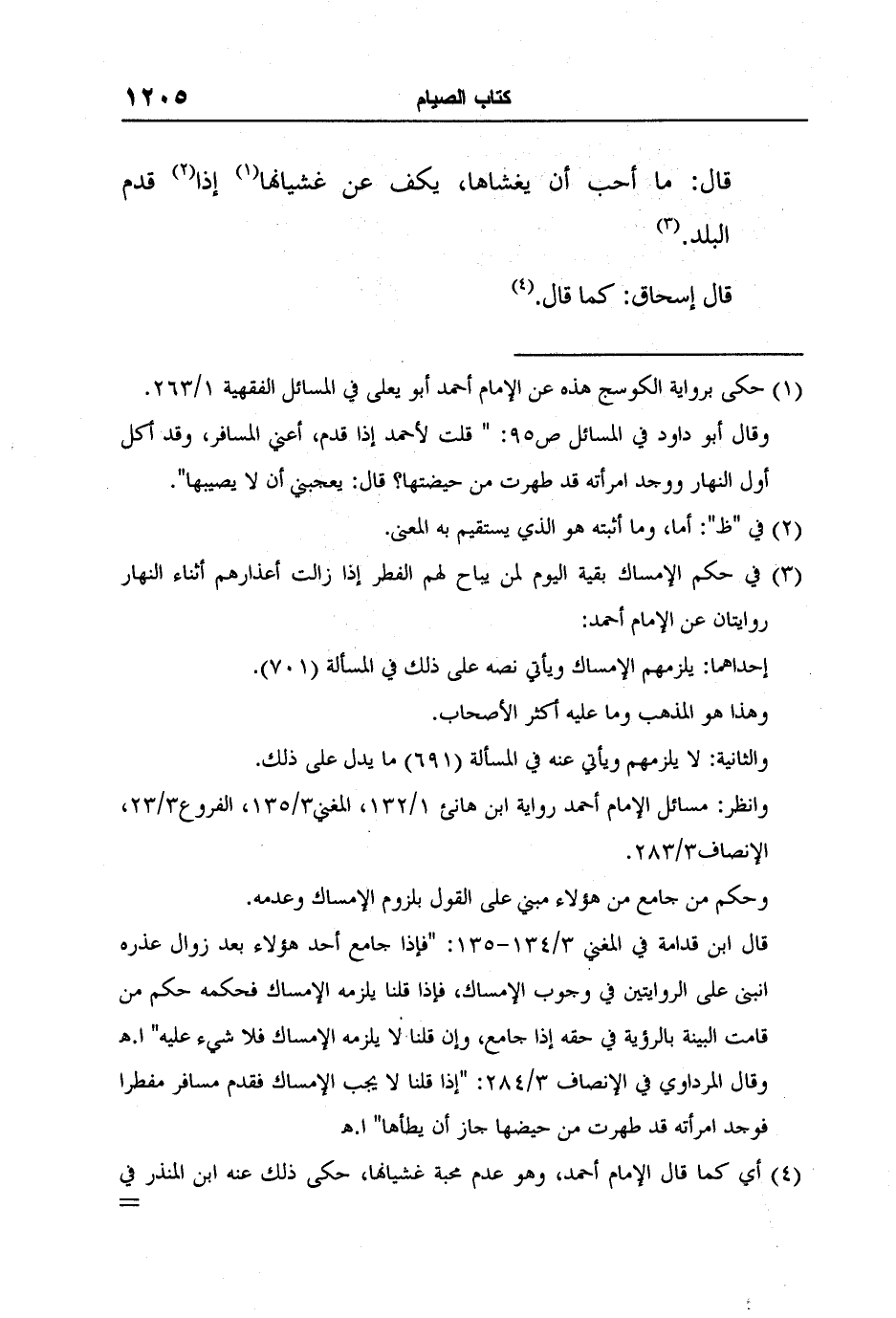 3 في حكم الإمساك بقية اليوم لمن يباح لهم الفطر إذا زالت أعذارهم أثناء النهار روايتان عن الإمام أحمد: