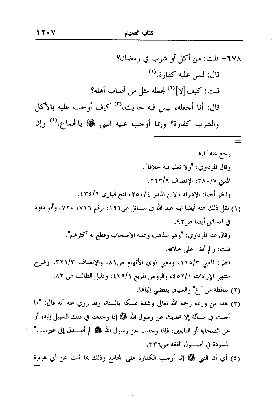 قال: أنا أجعله، ليس فيه حديث،3 كيف أوجب عليه بالأكل والشرب كفارة؟ وإنما أوجب عليه النبي صلى الله عليه وسلم بالجماع،4 وإن