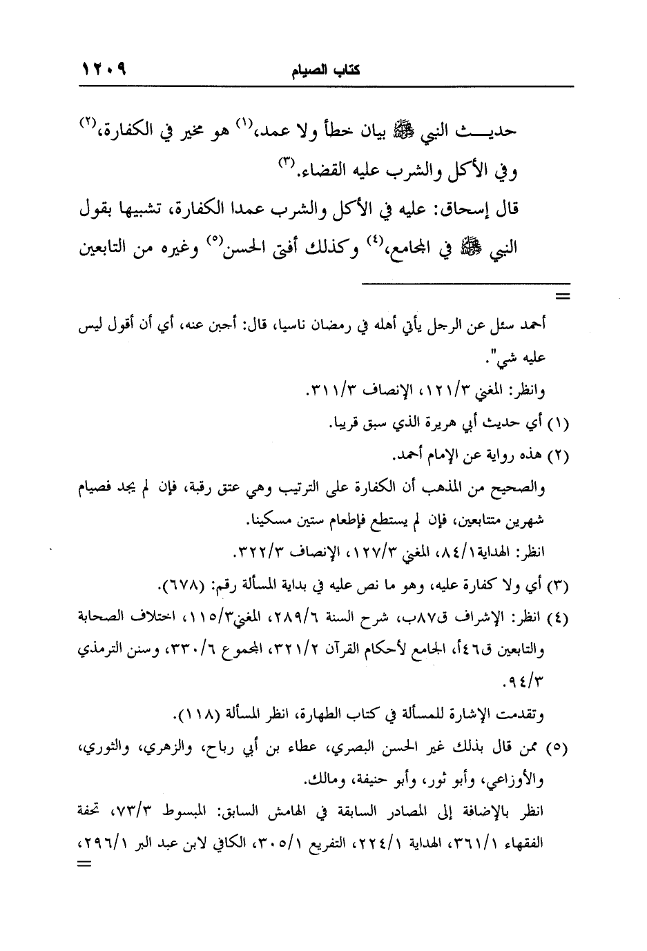 حديث النبي صلى الله عليه وسلم بيان خطأ ولا عمد،1 هو مخير في الكفارة،2 وفي الأكل والشرب عليه القضاء.3