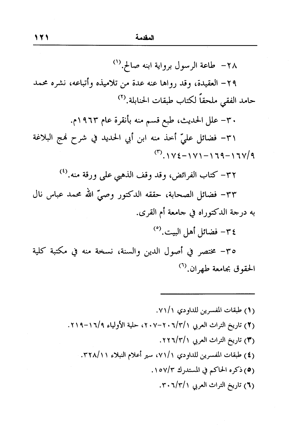 29- العقيدة، وقد رواها عنه عدة من تلاميذه وأتباعه، نشره محمد حامد الفقي ملحقاً لكتاب طبقات الحنابلة.2